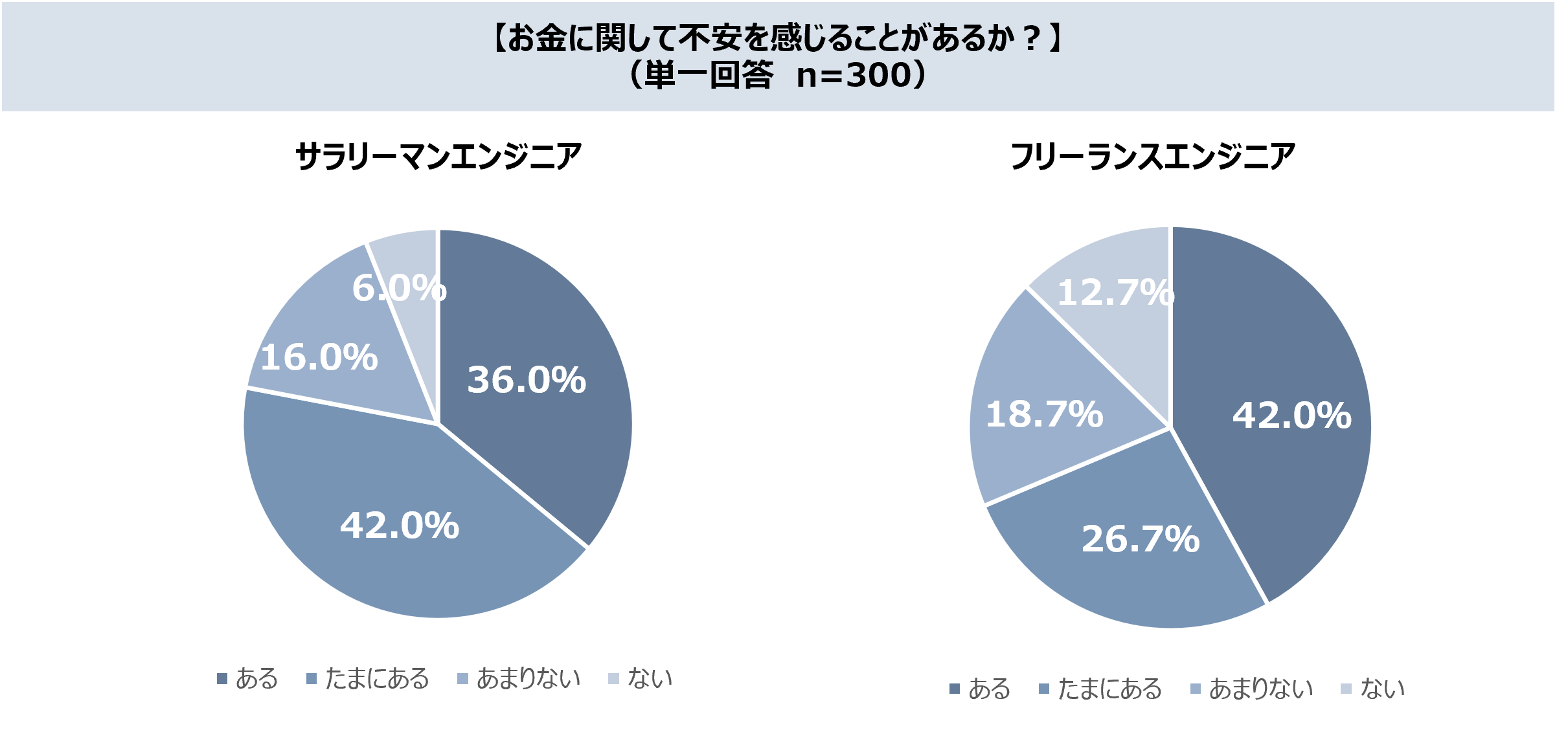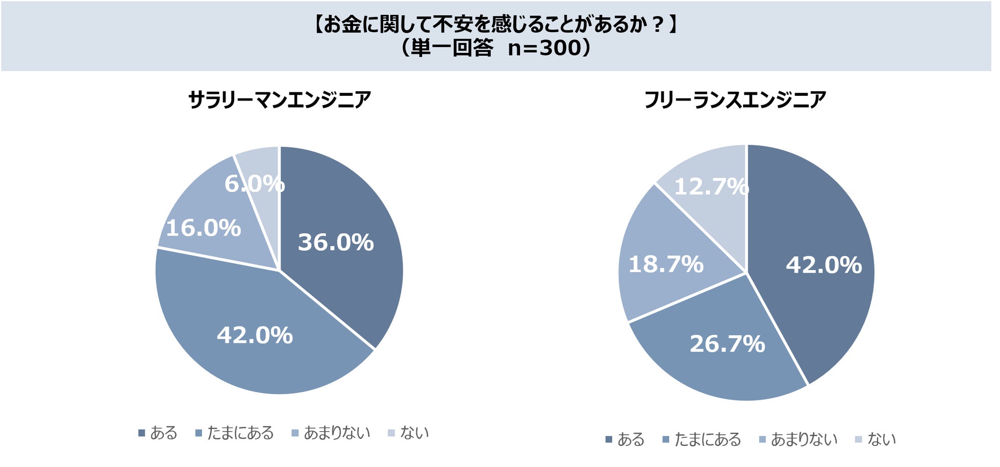 一方、お金に関して不安を感じることがあるかと質問をしたところ、サラリーマンエンジニアの約8割が「不安を感じることがある(たまにある)」と回答したのに対して、フリーランスエンジニアは約7割ににとどまっています。