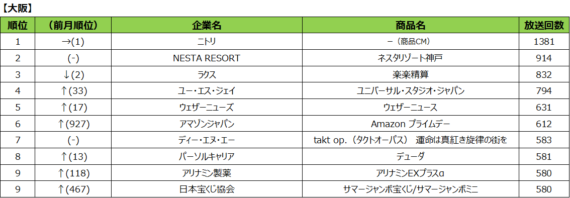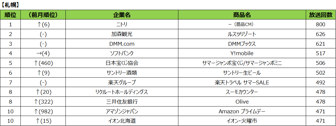 また、各地区のランキング上位に、その付近のレジャー施設のCMがランクインしました。ユー・エス・ジェイ「ユニバーサル・スタジオ・ジャパン」は、大阪地区で4位、名古屋地区で1位でした。大阪地区ではNESTA RESORT「ネスタリゾート神戸」が2位、札幌地区では加森観光「ルスツリゾート」が2位にランクインしました。