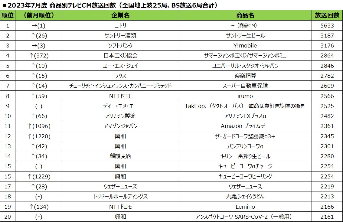 2023年7月度テレビCM放送回数ランキング発表~夏の過ごし方を提案するCMが多数ランクイン~