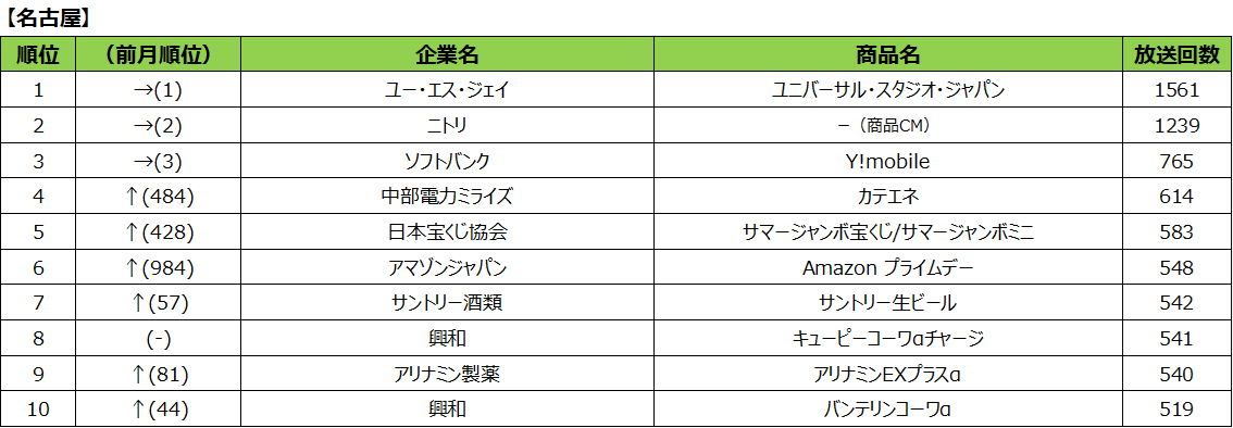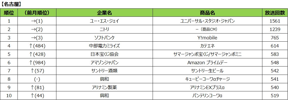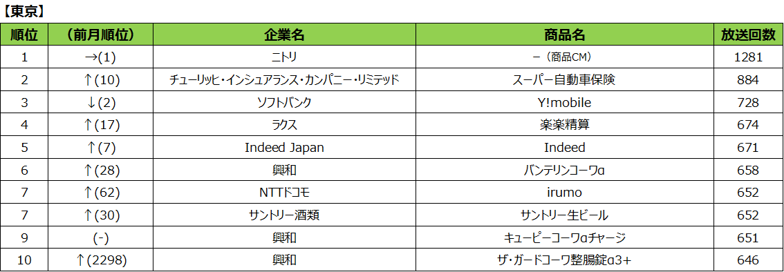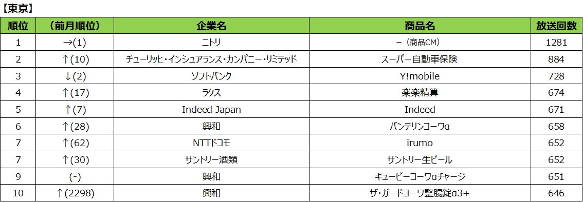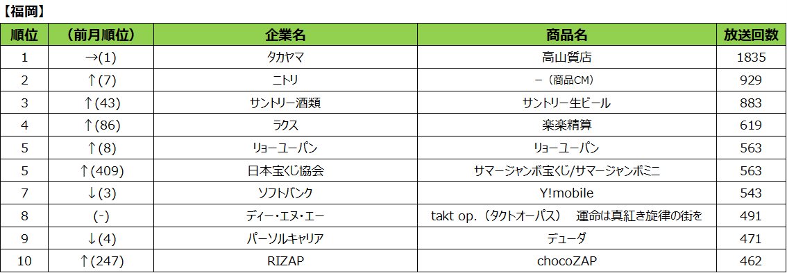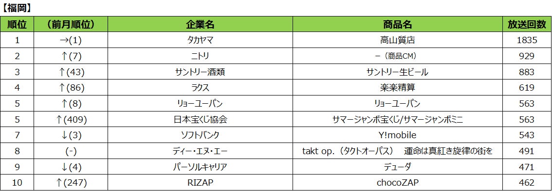 2023年7月度 エリア別テレビCM放送回数ランキング
