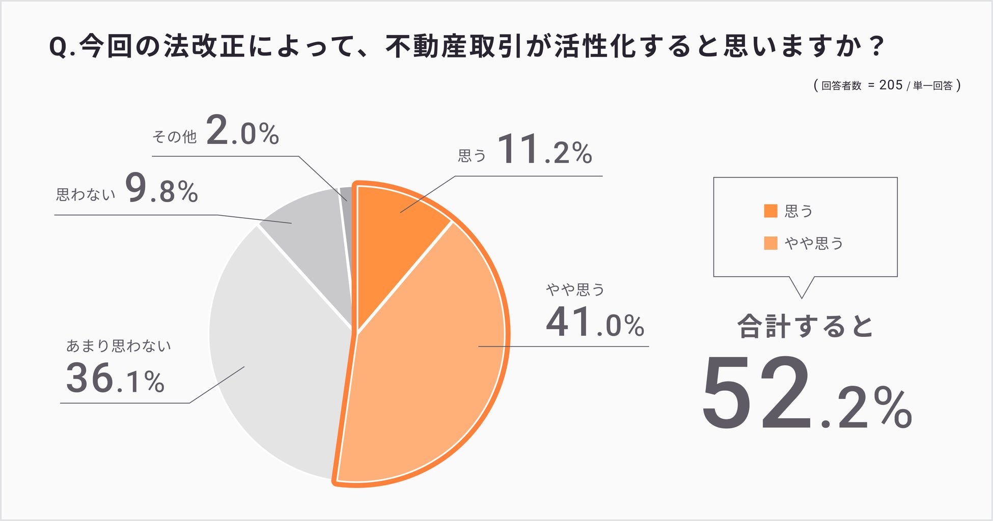 最後に、今回の法改正が取引の活性化につながるかどうかについて聞いたところ、52.2%が「思う」「やや思う」と回答し、45.9%が「あまり思わない」「思わない」と回答しました。