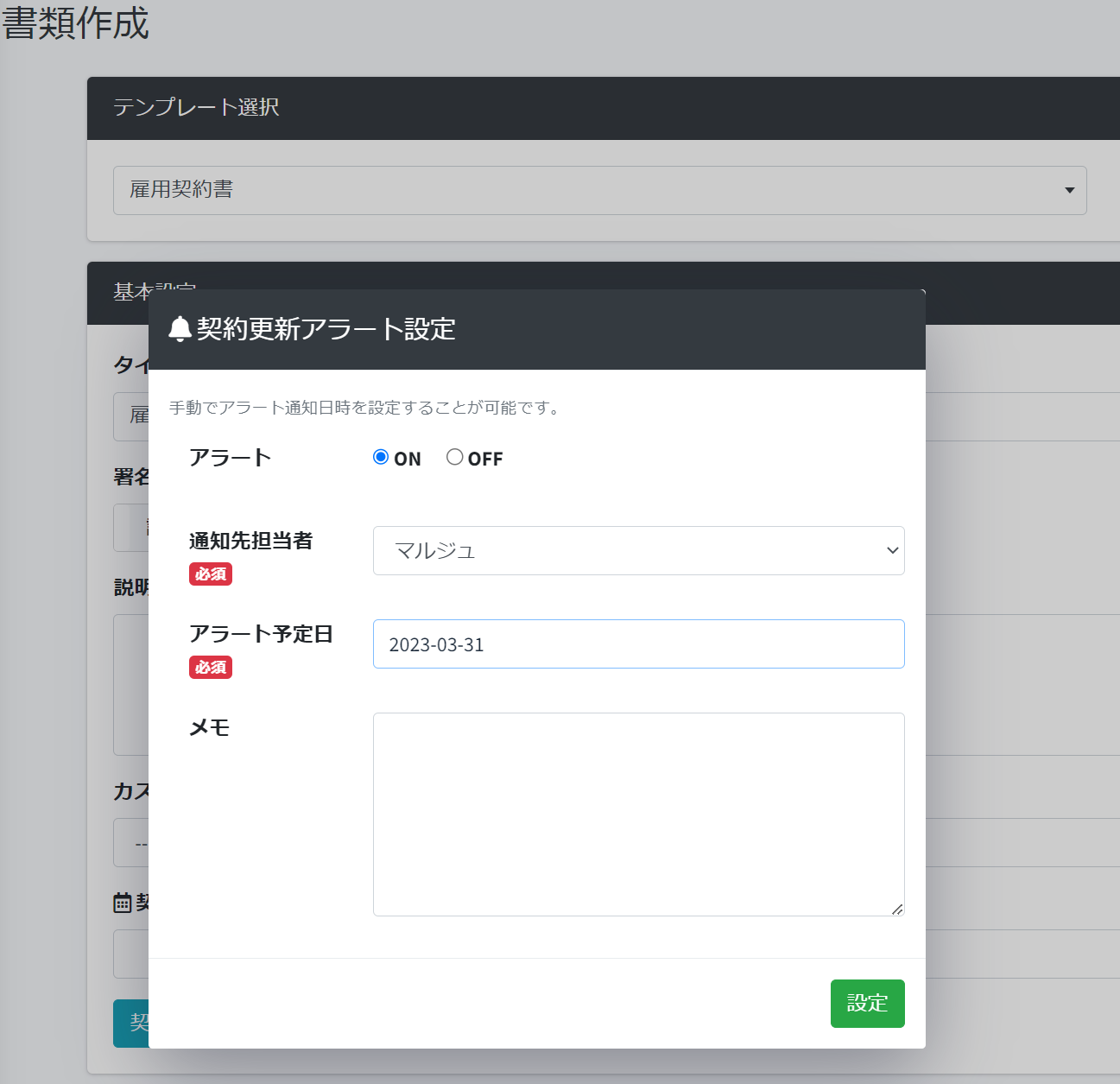 各書類ごとにアラート通知日を設定することが可能です。 書類作成時に書類単位で、アラート通知の設定が可能です。手動アラートの場合は任意の担当者宛にアラート通知を送信出来ます。