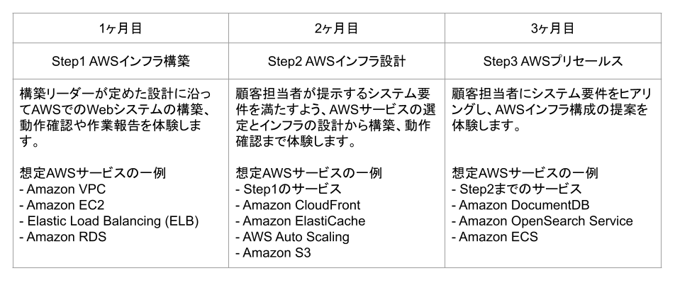 基礎となる構築技術から始め、実務応用力が求められるインフラ設計、プリセールスまでの、3つの業務工程をそれぞれロールプレイで擬似的に体験します。