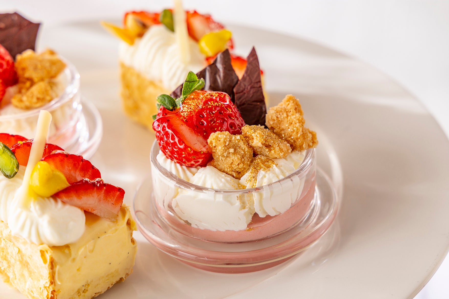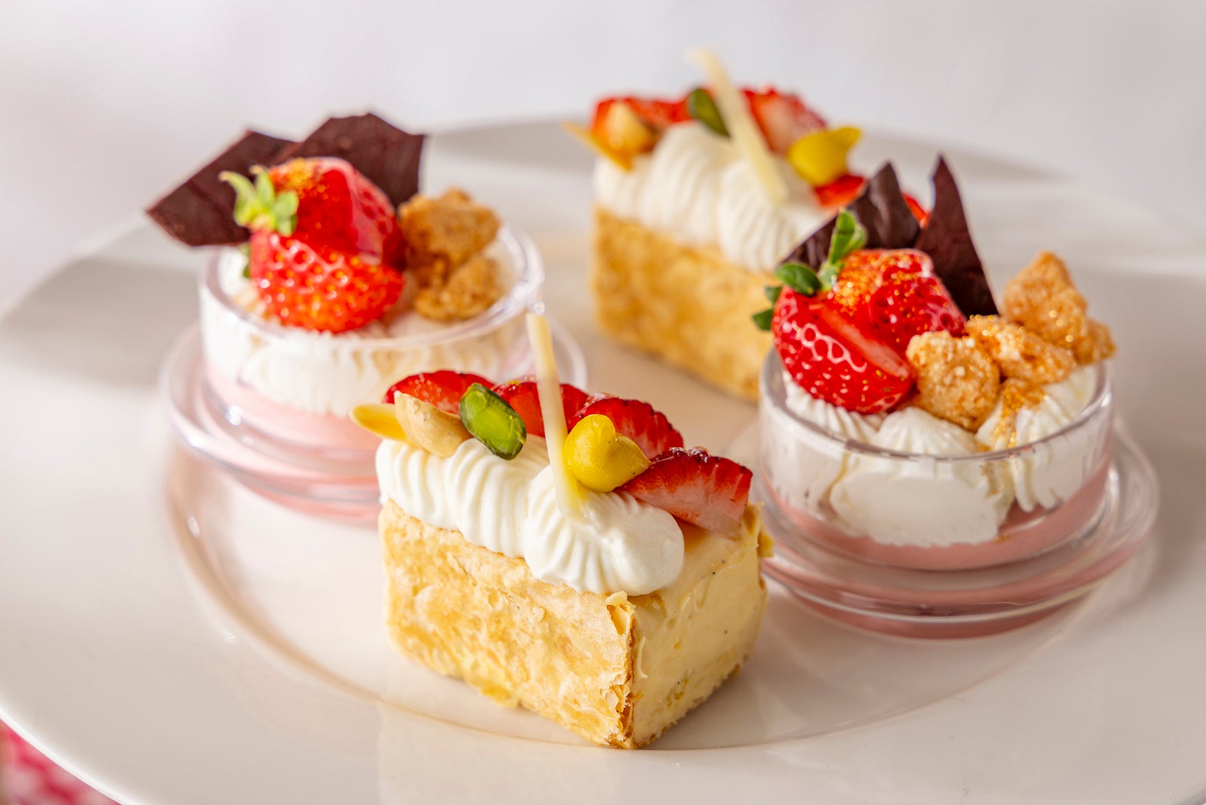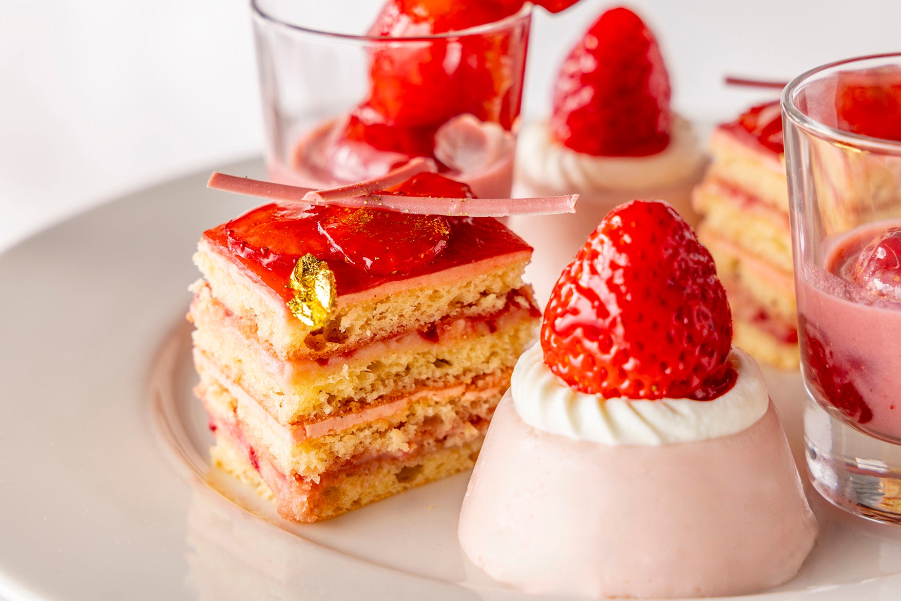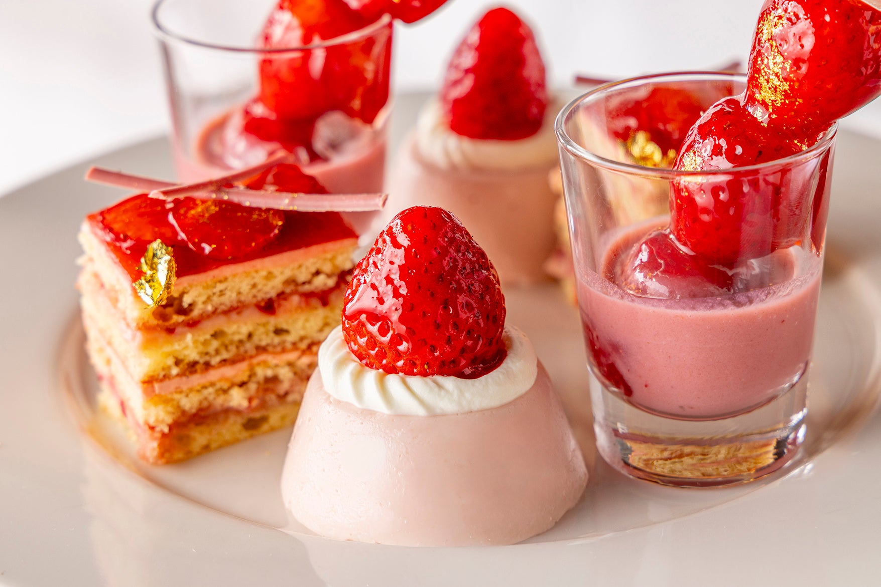 スイーツは、ぷるぷると揺れるなめらかないちごホワイトチョコレートプリンや、甘酸っぱさが広がるいちごディップ付きのいちごロリポップ、ピスタチオの食感とともに楽しむいちごオペラなど、いちごの魅力を存分に引き立てる愛らしいラインナップ。