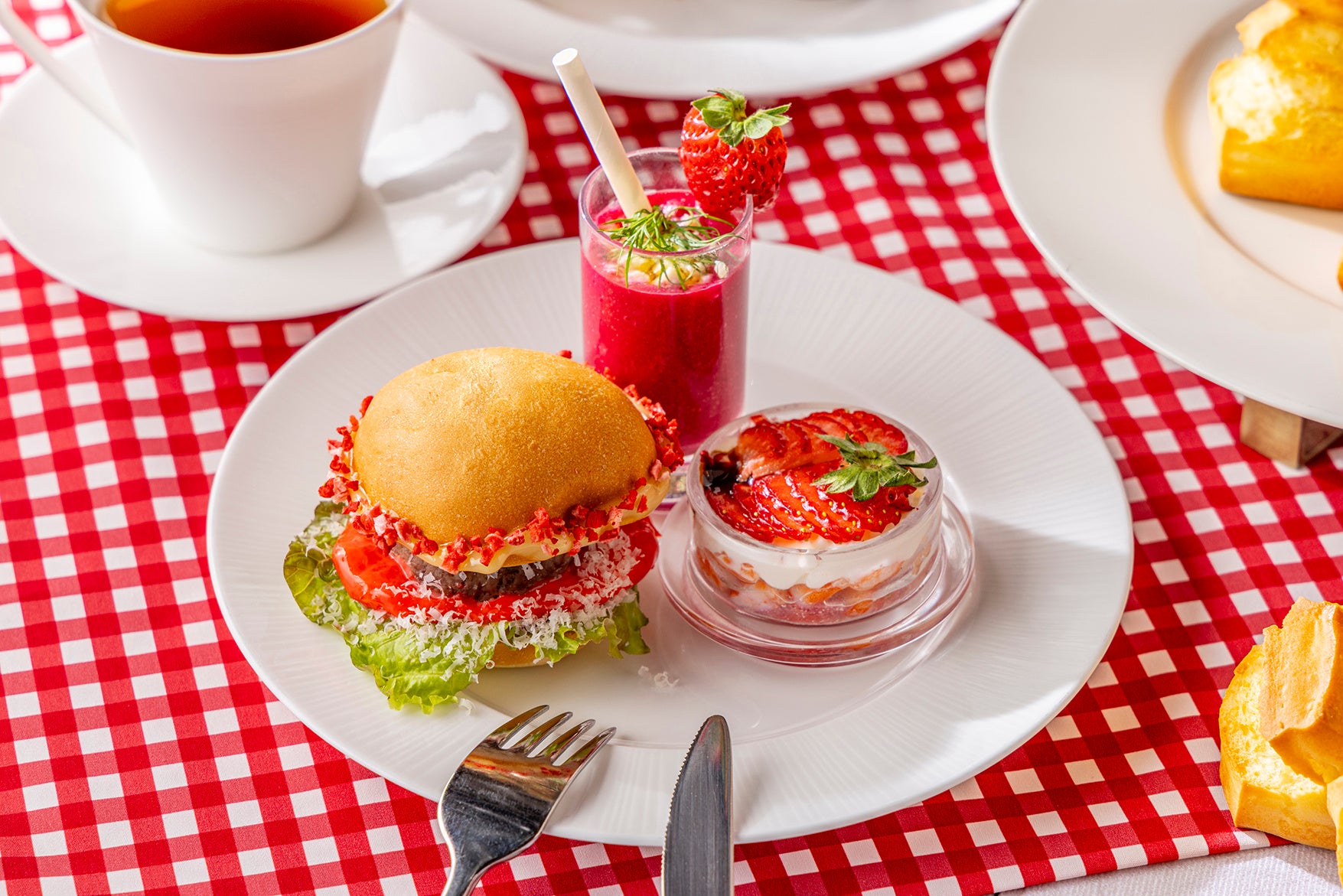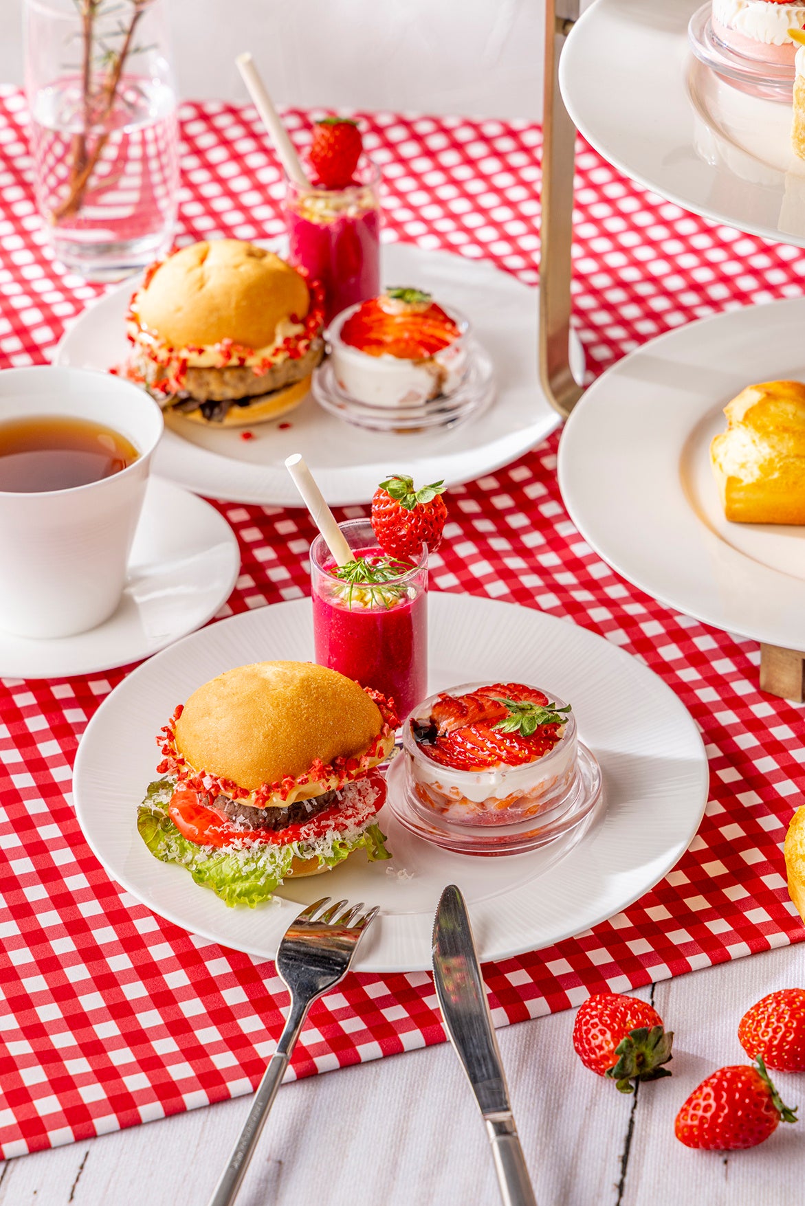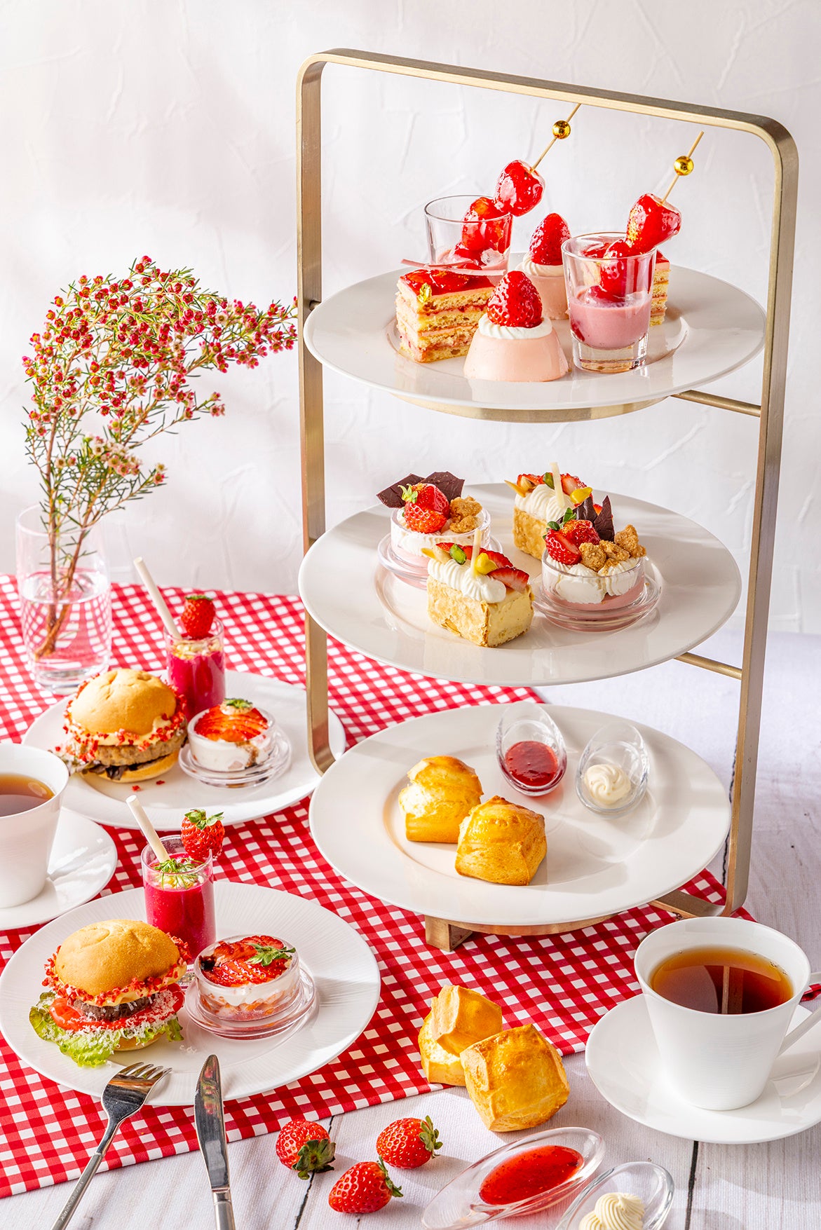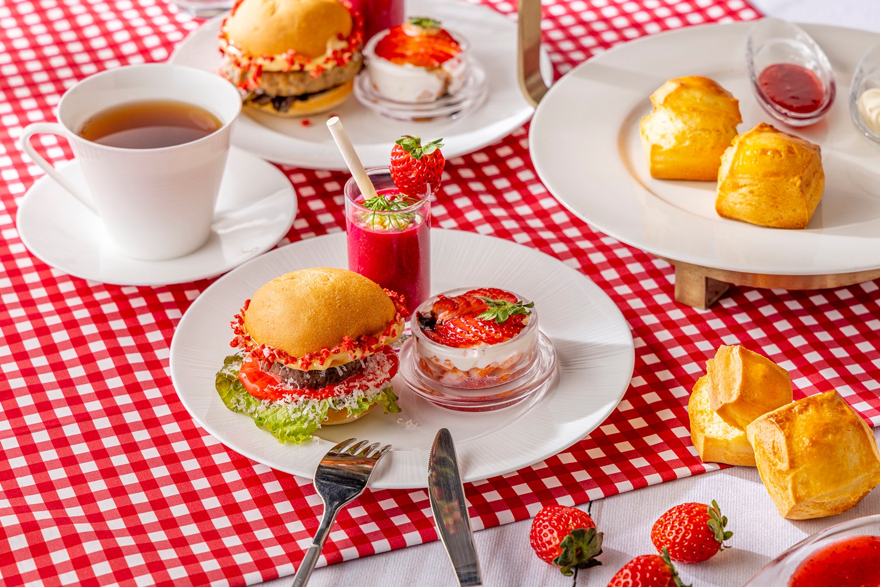 スコーンやセイボリーにもいちごのエッセンスを取り入れ、海老のタルタルにはいちごとバルサミコの深みある酸味を添え、ミニバーガーにはさりげないアクセントをプラスしました。冬ならではの、贅沢ないちご尽くしのアフタヌーンティーをお楽しみいただけます。