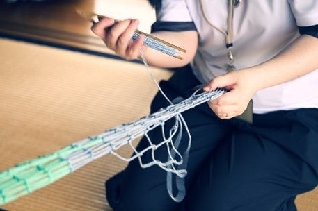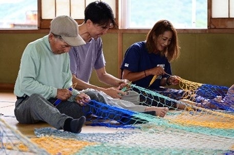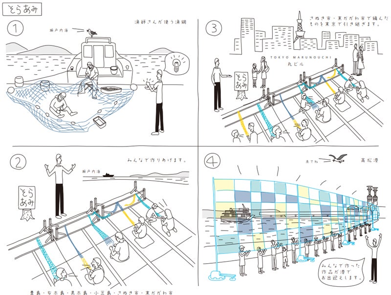アーティスト 五十嵐靖晃氏と漁網を編むワークショップ。夏会期に向け、志度・津田エリアと引田エリアにて、地元漁師や地域の方々、瀬戸内国際芸術祭のボランティアサポーター・スタッフ「こえび隊」が編んだ網(そらあみ)を受け継ぎ、東京・丸の内で作品を完成させます。