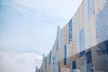 2013年・2016年・2019年に沙弥島を始めとする与島5島や香川県西部の島々で、網を編みあげる大規模な作品制作を行ってきたアーティストの五十嵐靖晃氏。芸術祭春会期に向け東部の島々(豊島・女木島・男木島・小豆島)において、また、夏会期に向けて新会場の引田エリア、志度・津田エリアで、地元漁師や地域の方々、こえび隊と一緒に6つの網を作り上げました。これらと丸ビルで編んだものが繋がり、高松港に掲げられます。