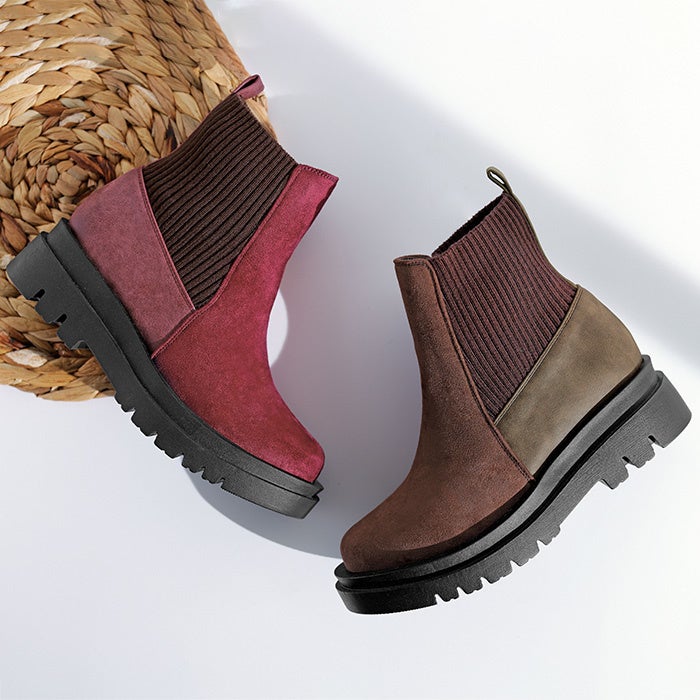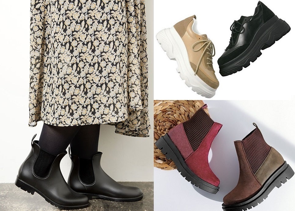 今回は、コーディネートの足元をアップデートするアイテムをピックアップ。機能性とデザイン性を兼ね備えた「はっ水!ボリューム厚底スニーカー」、シンプルなデザインでスタイリッシュにはくことができる「サイドゴアレインブーツ」、大人な配色で着こなしのアクセントになる「異素材切替リブニットデザインブーツ」の3商品です。