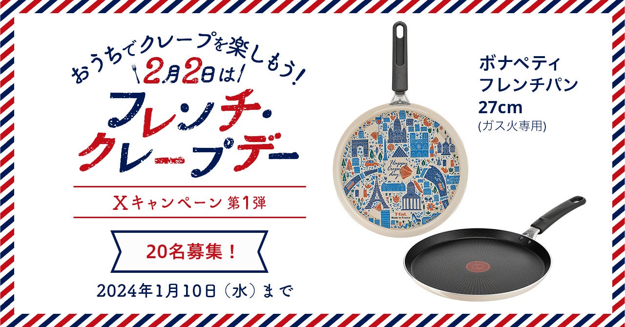 ティファールでは、「フレンチ・クレープデー」を楽しんでいただくキャンペーンを、InstagramとX(旧Twitter)で実施しています。Instagramでは、おうちでクレープ作りを楽しんでいる写真を投稿していただいた方の中から抽選でティファール商品をプレゼントします。Xでは新発売の「ボナペティ フレンチパン 27㎝」を使って、おうちクレープを楽しみたい方20名様を募集するキャンペーンを実施いたします。