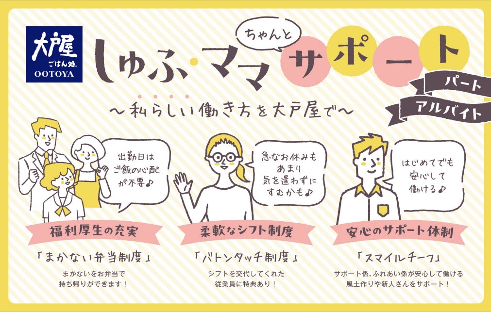 株式会社大戸屋(本社:神奈川県横浜市、代表取締役社長:蔵人 賢樹、以下「大戸屋」)は、家庭と仕事の両立を支援する新たな取り組みとして、『大戸屋しゅふ・ママちゃんとサポート』を開始いたしました。このプロジェクトは、しゅふやママが自分らしい働き方を実現できるよう、柔軟な働き方や働きやすい環境作りを進めております。