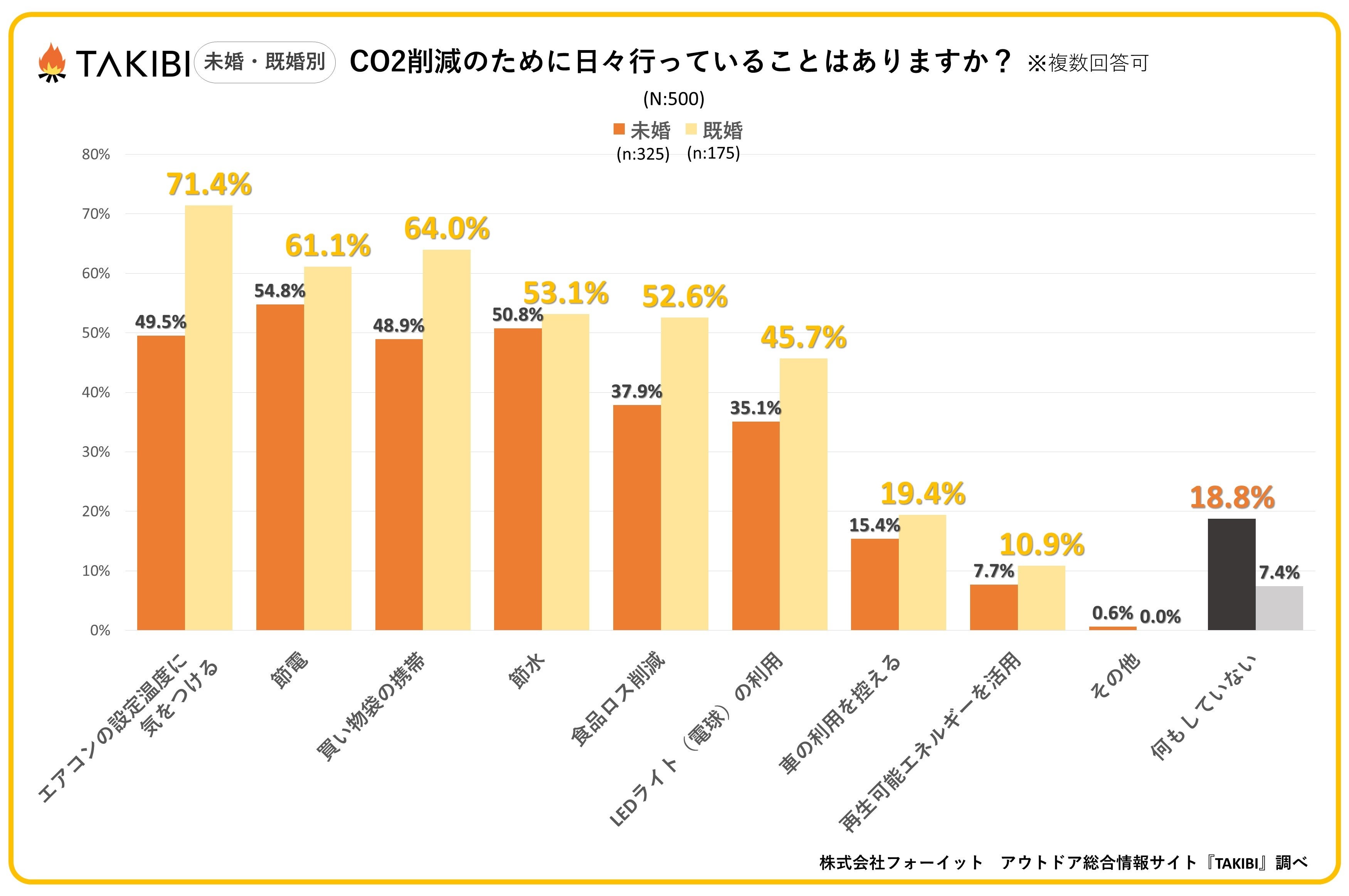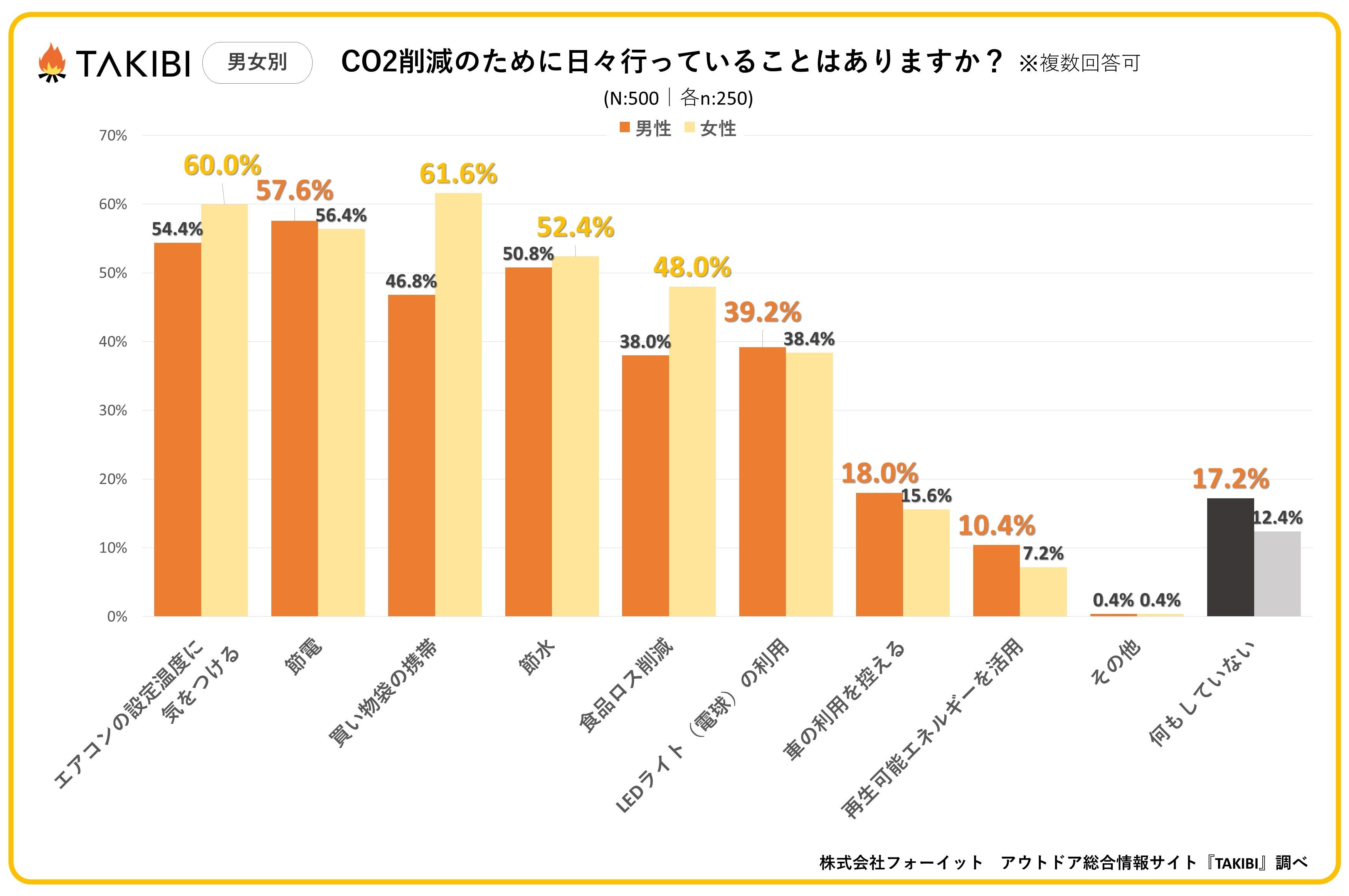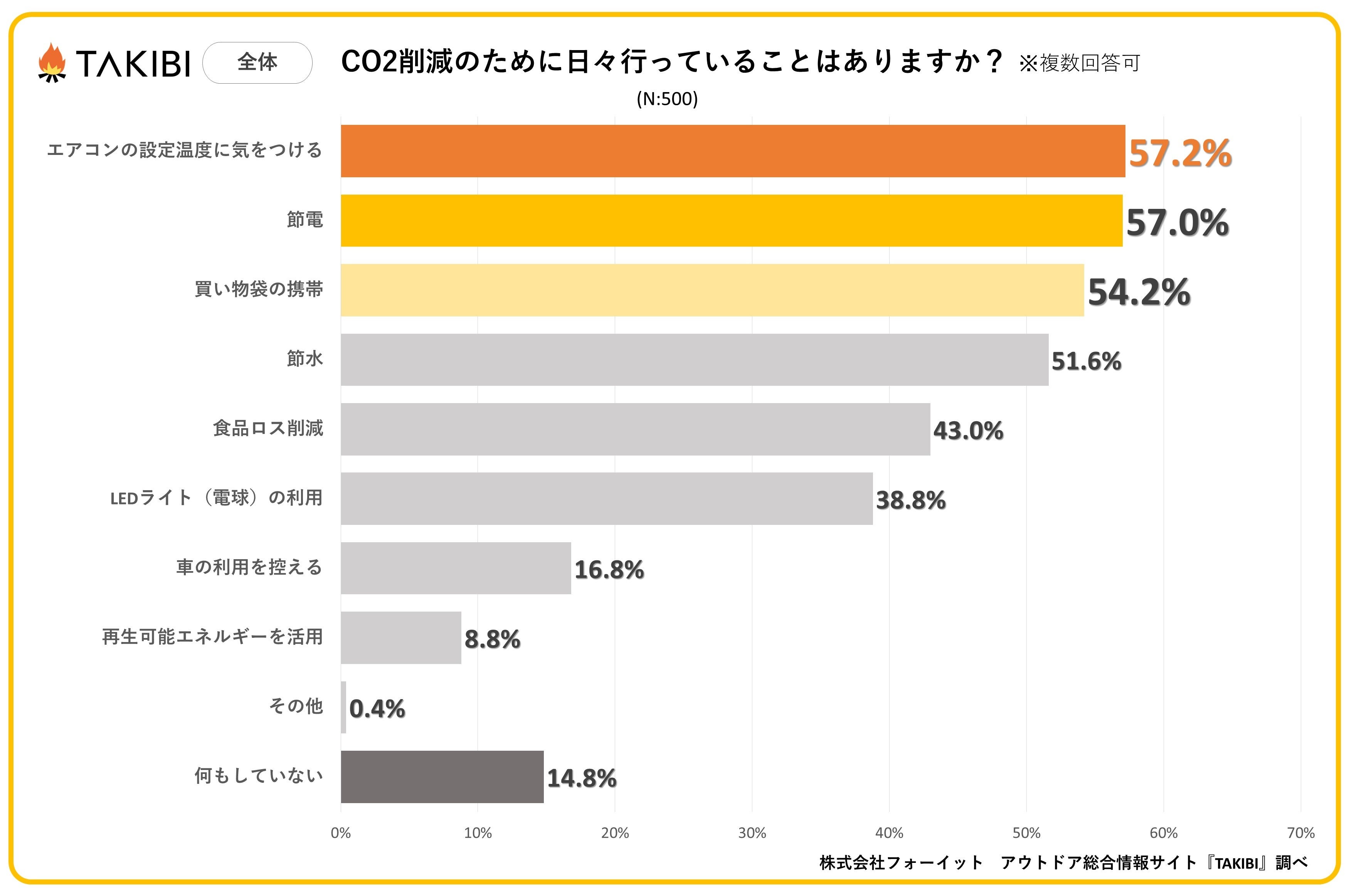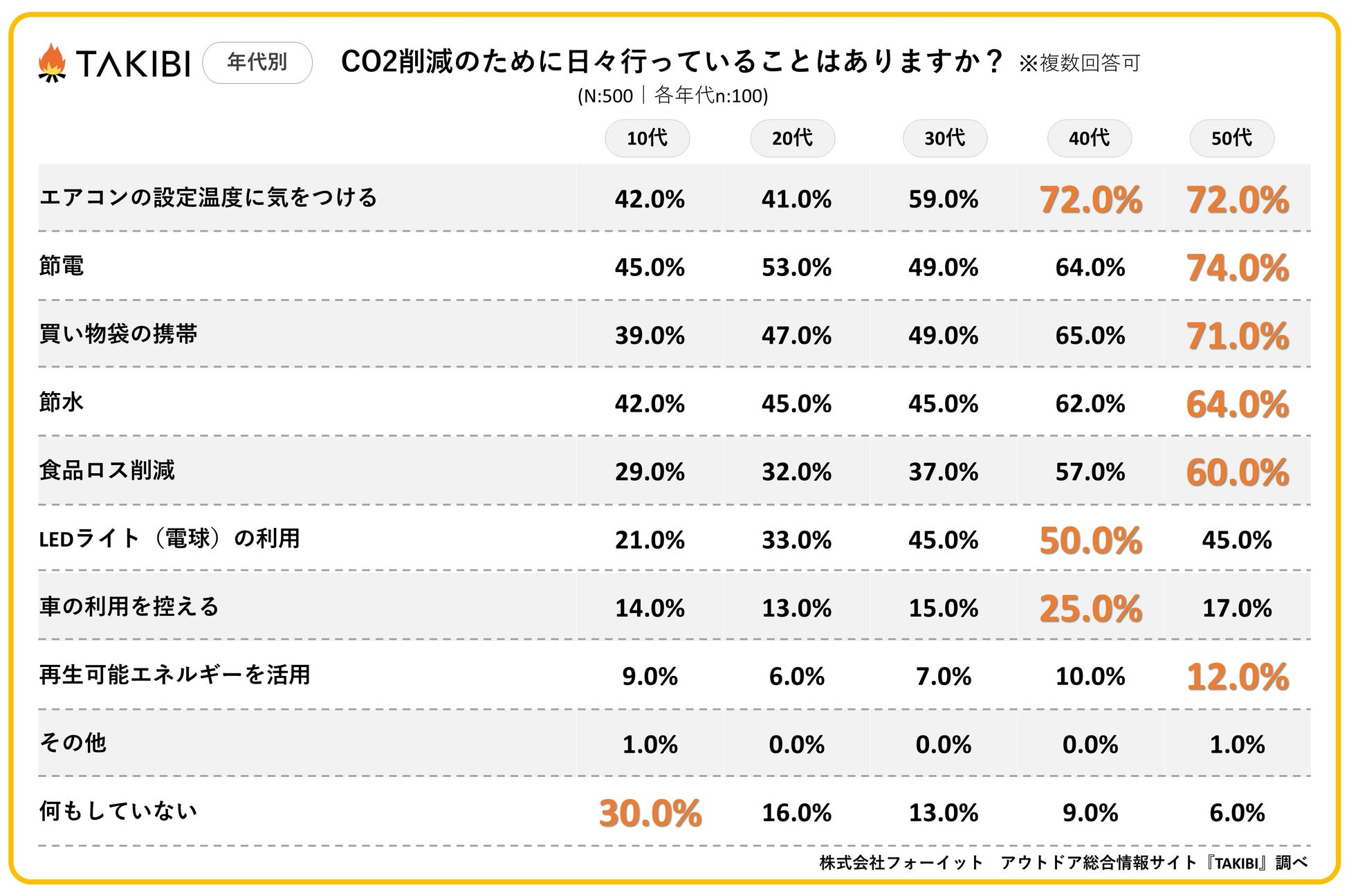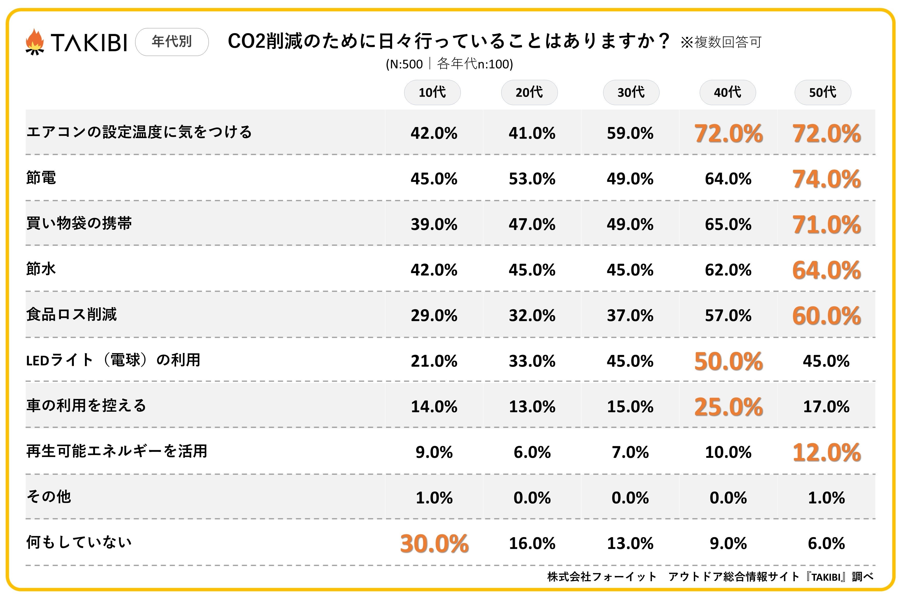 キャンプやグランピングを中心としたアウトドア総合情報サイト「TAKIBI」の運営をおこなう株式会社フォーイットは、全国の10代~50代までの男女500人を対象にCO₂削減のために取り組んでいることに関するアンケートを実施し、男女別・年代別等の特徴についてまとめました。