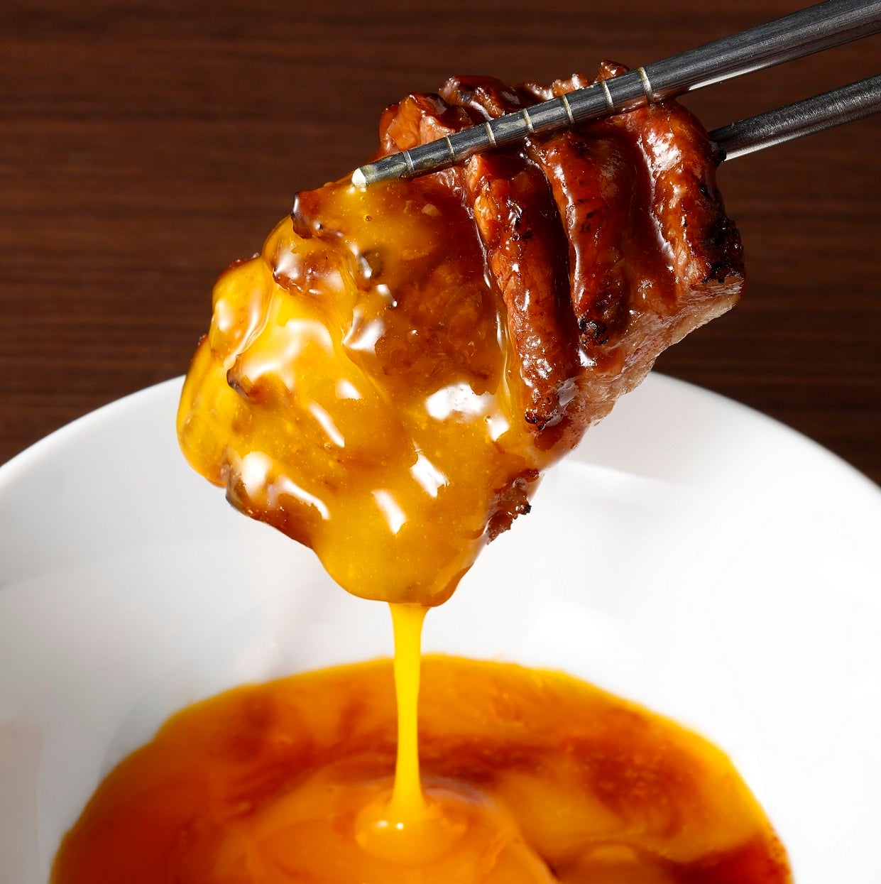 肉質がやわらかく脂の旨みを堪能できる30日間熟成したジューシーなカルビに味噌ダレを合わせ、とろ~り卵にからめて食べる「熟成厚切り月見カルビ」。味噌は長期熟成することによりコクと深みを増し、卵と合わせても負けない存在感があります。ごはんと合わせると箸が止まらなくなる、まさに“悪魔的”なカルビです。