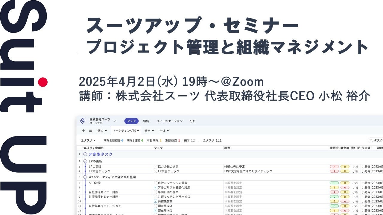 株式会社スーツ(所在地:東京都千代田区、代表取締役社長CEO:小松 裕介)は、2025年4月2日(水)19時から、当社代表の小松が講師を務めるスーツアップ・セミナー「プロジェクト管理と組織マネジメント」を無料開催します!