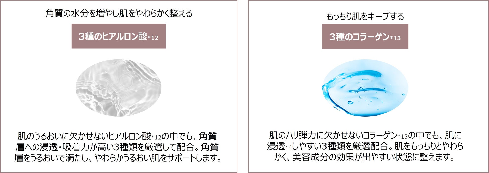 ニードルリフトクリーム比で「3種のヒアルロン酸」と「3種のコラーゲン」をあわせて300%にアップ*11。肌をうるおいで満たし、やわらかくして美容成分の導入*4をサポートします。