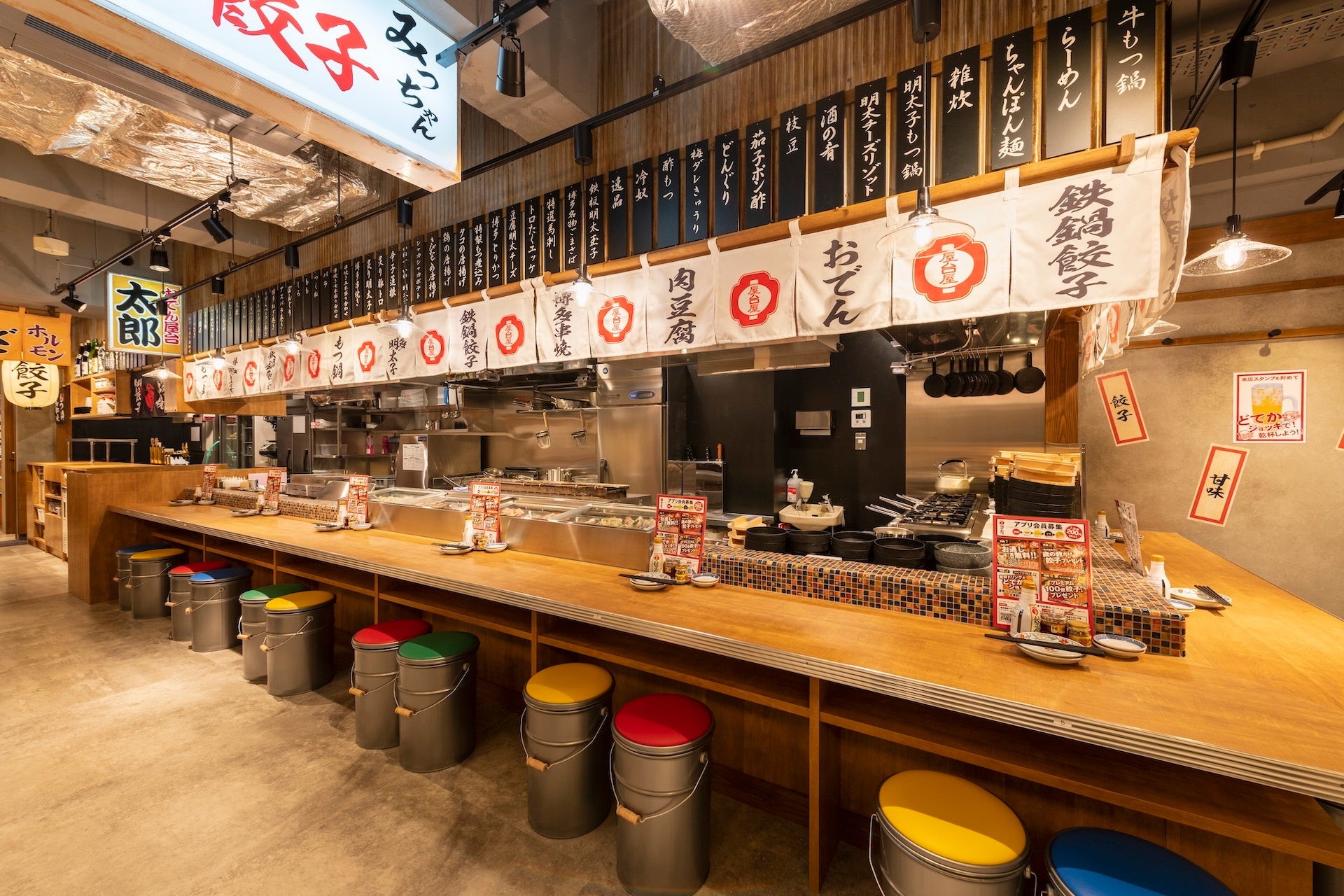 店内は博多中洲の屋台村を完全再現。祭り囃子をBGMに、粋の良いスタッフが創る熱気の渦を体感できるまさに“劇場型”の酒場です。元気、活気、笑顔溢れる空間をお楽しみください。