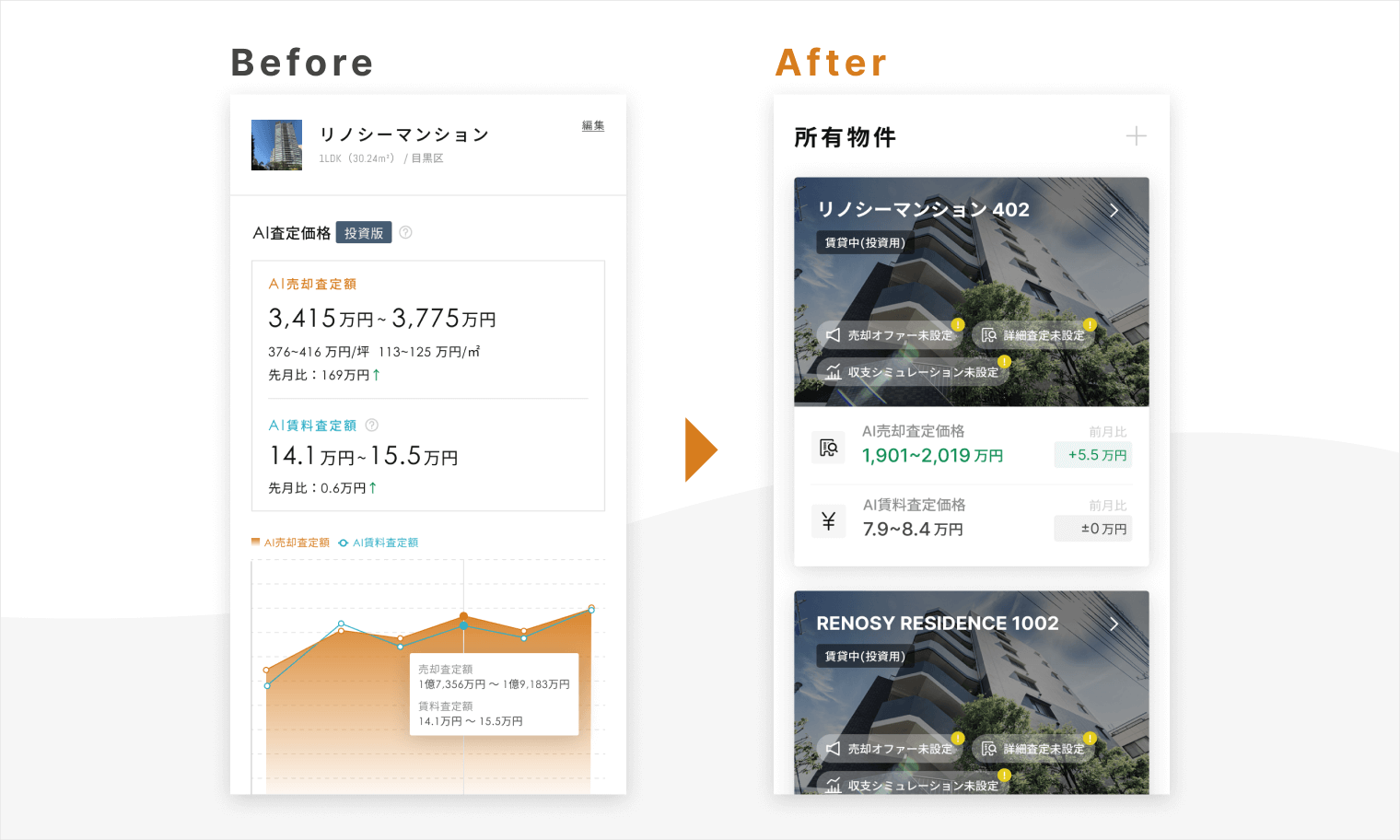 所有する投資不動産のAI査定額は登録後、月単位で査定額を表示しています。今回のリニューアルで、直近6ヶ月から投資不動産AI査定を行った全期間を表示させるデザインへ変更しました。お客様の長期間の推移を確認したいといったニーズを踏まえた変更により、査定額の推移や不動産価格のトレンドが把握しやすくなっています。