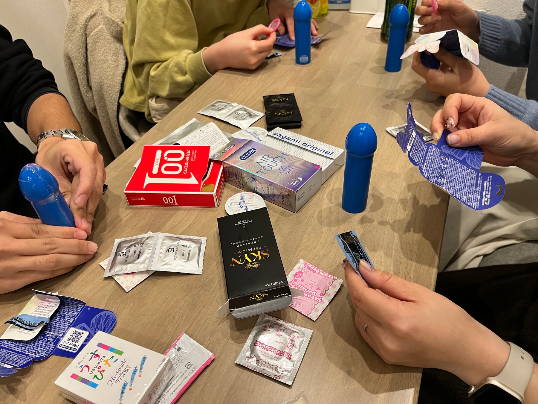 当日は、お茶を飲みながらリラックスした雰囲気で、学生それぞれの背景を交えながら日常では話題にしづらい性や避妊、ジェンダーについて話し合いました。また、コンドームの種類や購入時のポイントを学びながら、模型に装着するコンドームワークも実施しました。