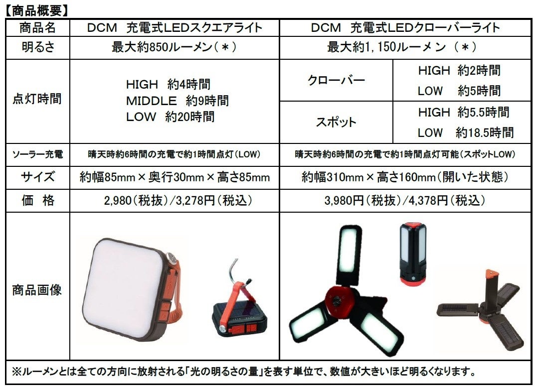 大いに重宝されています。また、災害時の停電の際などでは、充電用電源の確保が困難なことから、太陽光エネルギーを利用して充電が可能なアイテムの需要が高まっています。そこで今回、DCMは太陽光で補助充電が可能な 「DCM 充電式 LEDスクエアライト」と「DCM 充電式LED クローバーライト」の2機種を発売します。