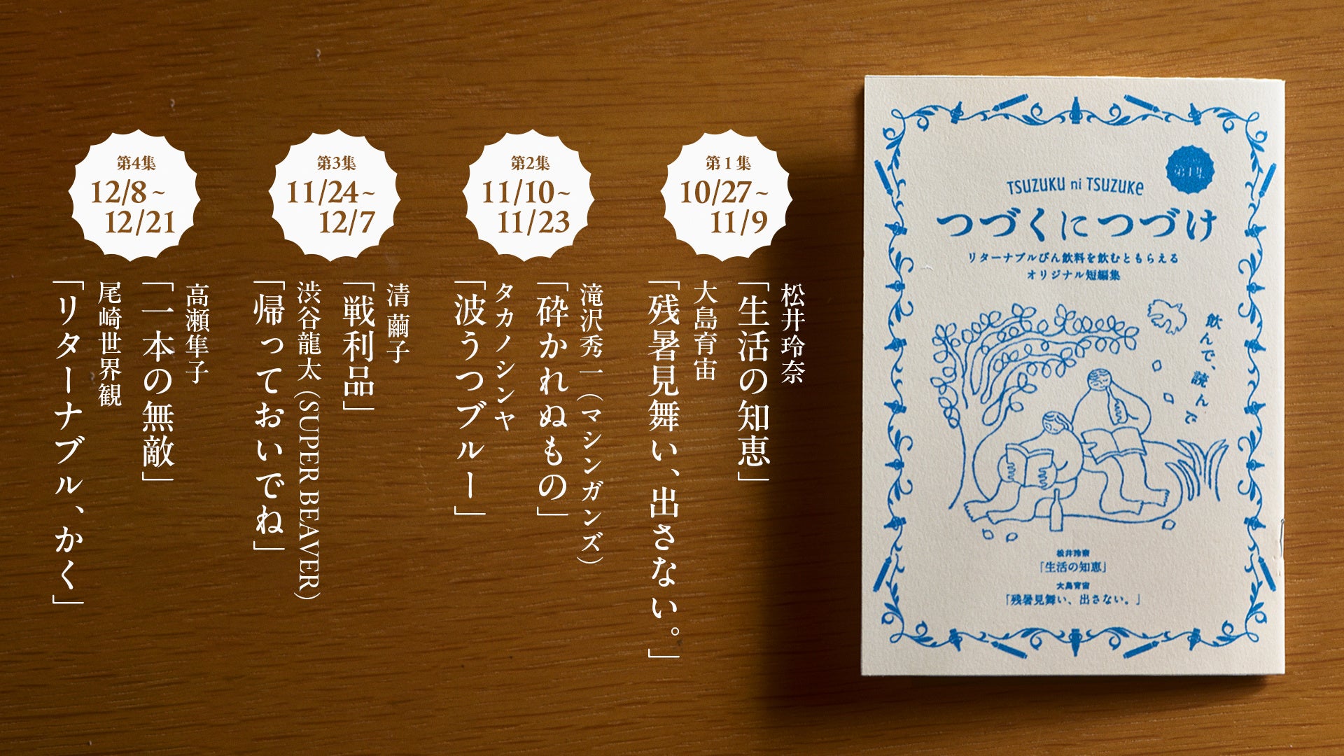 都内を中心にご参加いただく飲食店や銭湯にてリターナブルびん飲料をご購入いただくと、アーティスト、タレント、お笑い芸人、俳優、作家、ラジオパーソナリティーなど多彩な人たちによって執筆された短編小説がもらえるイベントです。