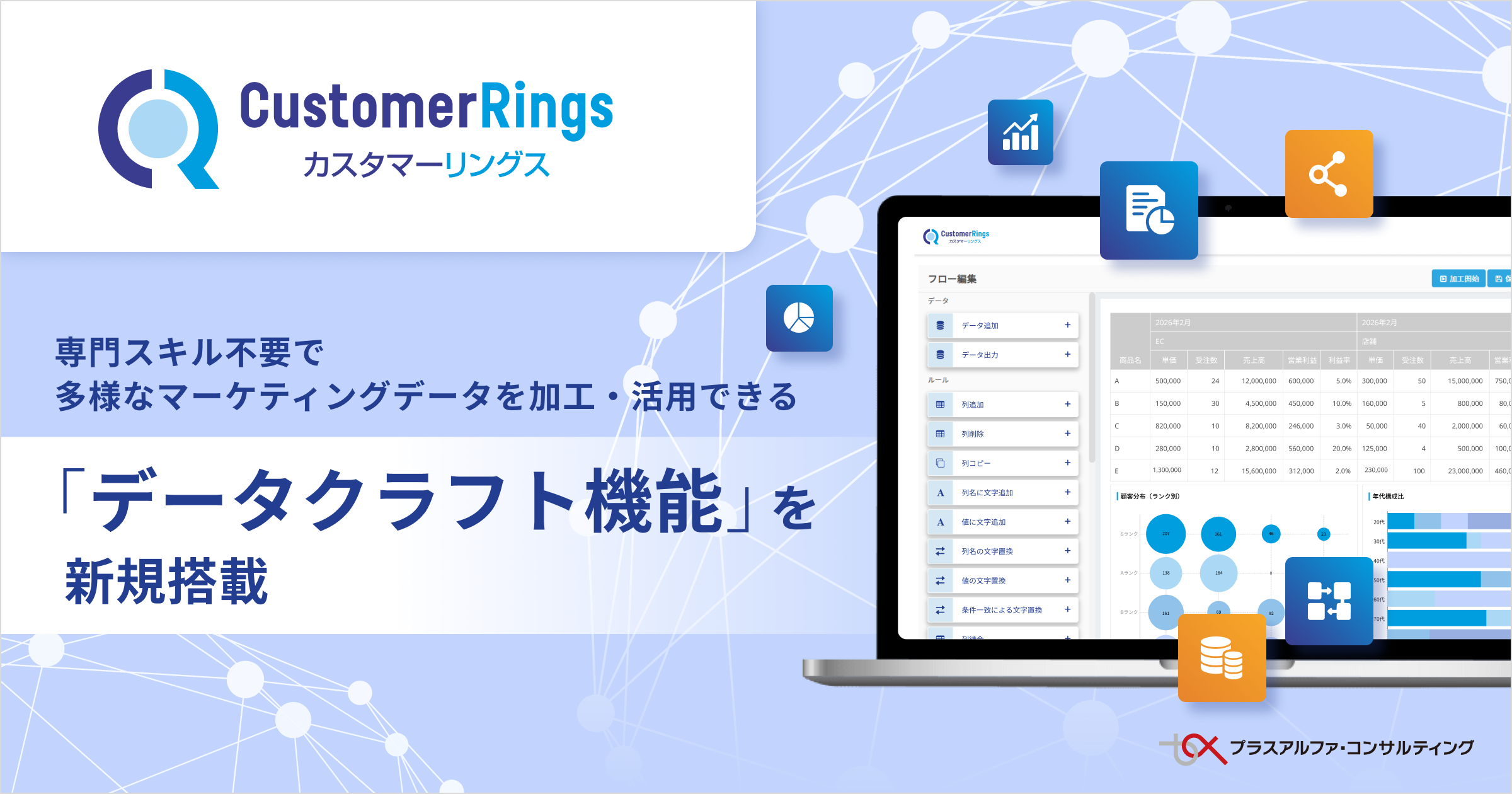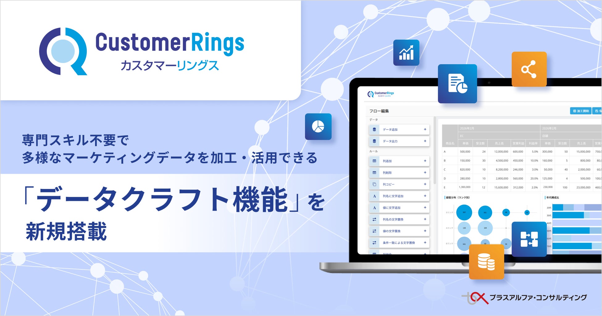 株式会社プラスアルファ・コンサルティング(本社:東京都港区、代表取締役社長:三室克哉 証券コード:4071、以下:PAC)は、CRM/MAツール 「CustomerRings(カスタマーリングス)」 に、直感的な操作のみでデータの収集・加工・可視化を完結できる 「データクラフト」 機能を新規搭載しました。