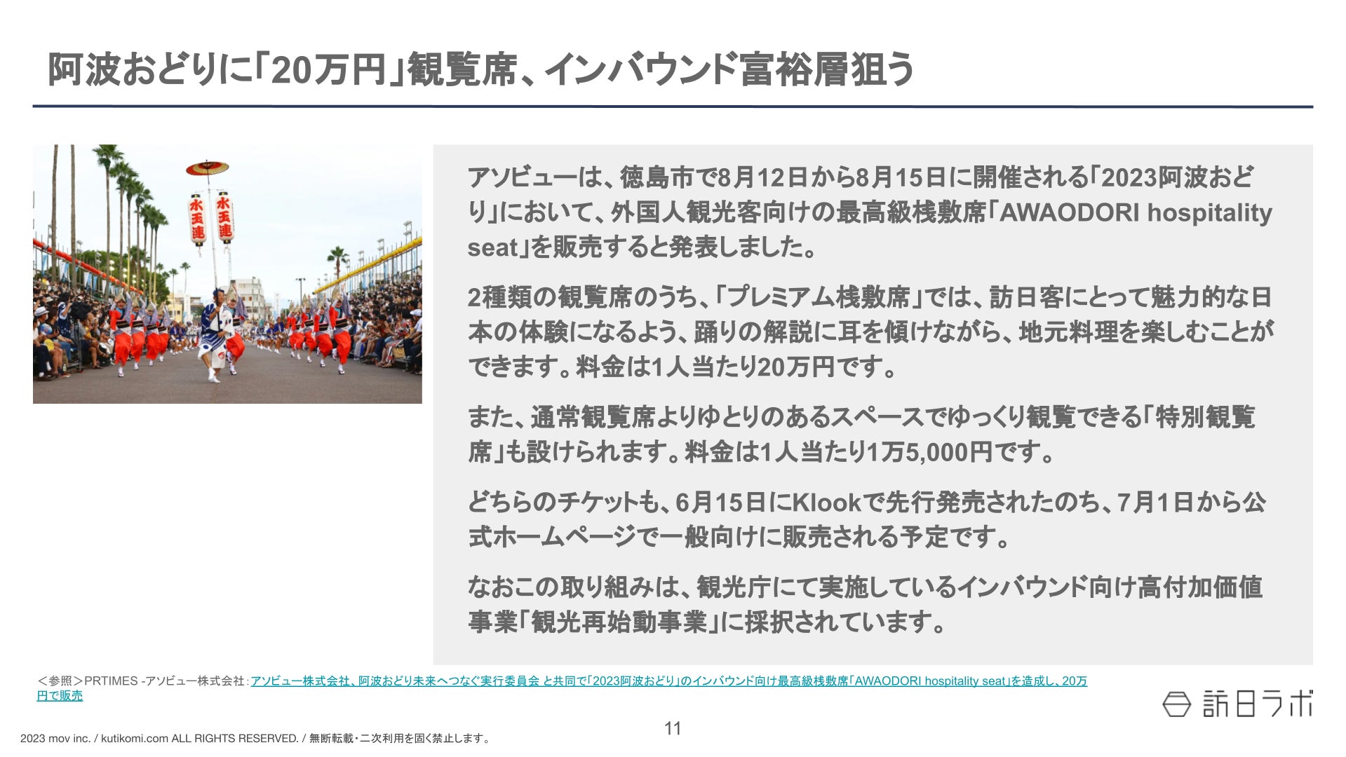 阿波おどりに「20万円」観覧席、インバウンド富裕層狙う / 4月外国人宿泊者数、コロナ後初「1,000万超」ほか