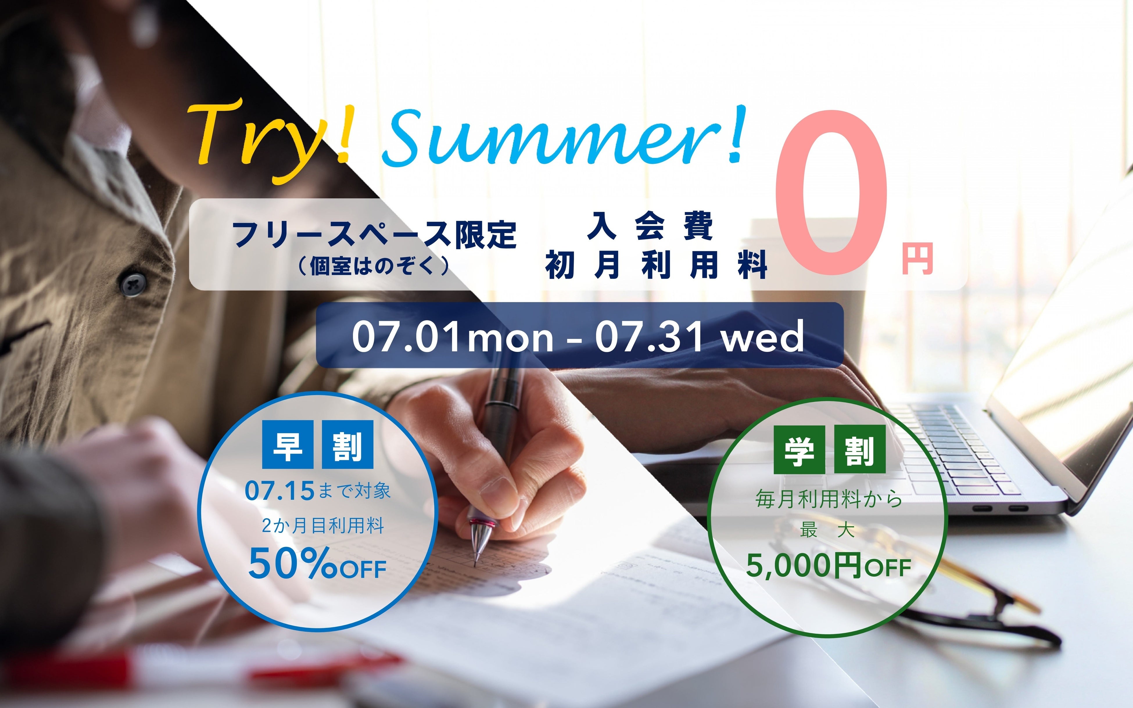 この度、フリースペースを利用する会員契約をされる方を対象に、入会金11,000円分および初月利用料無料となる「Try!Summer!キャンペーン」を開催いたします。
