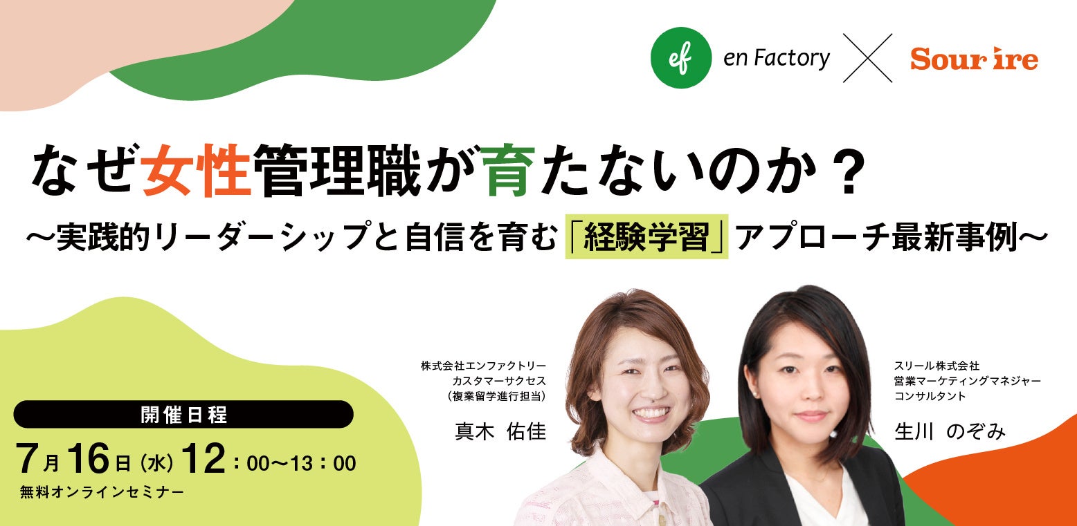 株式会社エンファクトリー(東京都千代田区、代表取締役社長CEO加藤健太)は、スリール株式会社(東京都文京区、代表取締役社長 堀江敦子)とともに、2025年7月16日(水)12:00より『なぜ女性管理職が育たないのか? ~実践的リーダーシップと自信を育む「経験学習」アプローチ最新事例~』セミナーを開催します。(イベントページ:https://form.k3r.jp/enfactory/20250716?k3ad=enfactory)