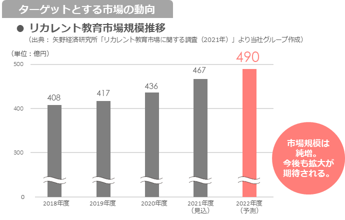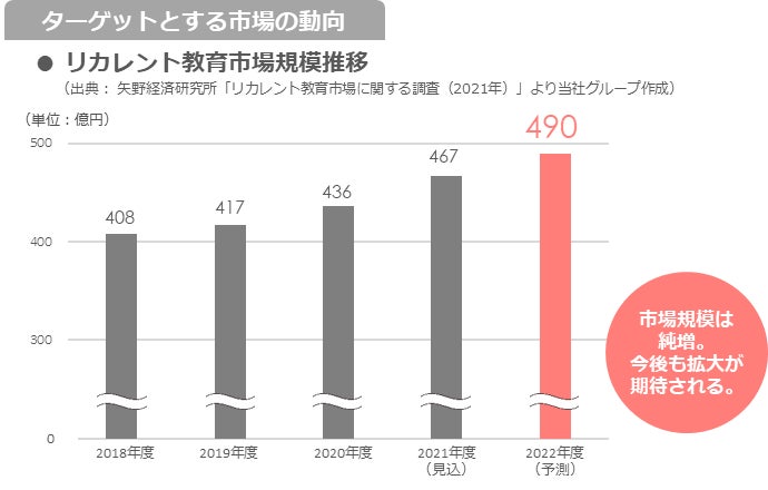 これからの社会や仕事においては、特にAIやDXによる業務効率化が進み、仕事のプロセス変化や、業務上で扱う新たなシステム、ソフトウェアの活用など、それらに対応するための知識やスキルをアップデートすることが必要となります。学校教育を既に卒業した方や社会人の学び直しへの関心が高まり、政府においてもリカレント教育を推進する方針が打ち出され、関連省庁ではさまざまな施策が実施されています。今後益々これらのニーズは高まると共に、教育機関においても少子化が加速する中での新たな教育需要として取り組みが強化されることが期待されています。また、習得したスキルを証明する各種検定や資格取得の需要も高まるものと想定しています。