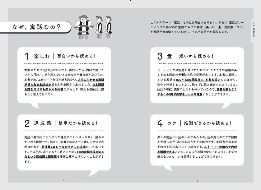 寓話にはオチがあるものが多く、英語が難しくてもストーリーの流れで内容を推測しやすいのが特徴です。これにより、英文を読むコツも自然と身につきます。