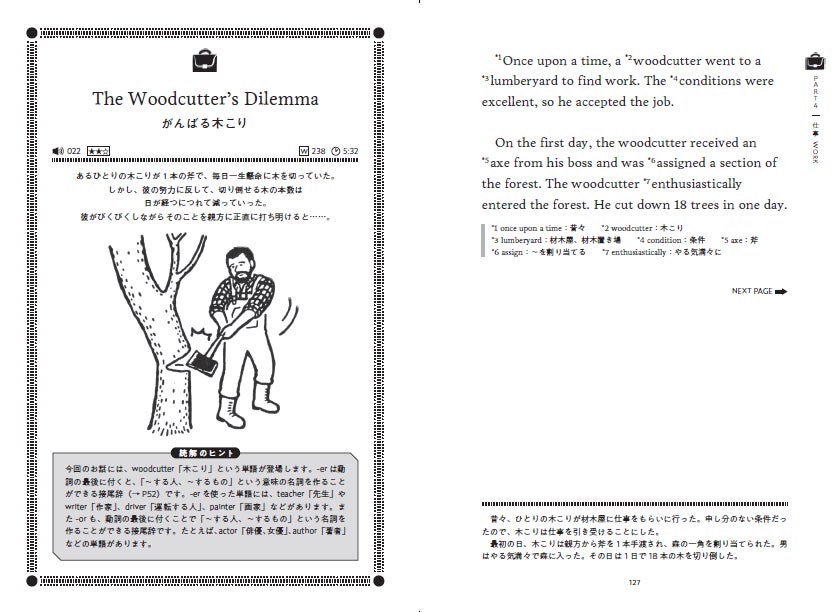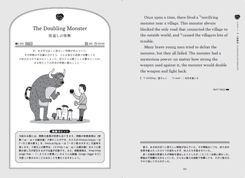 英文の難易度は中学生~高校1年生レベル。日本語訳や語注も充実しているので、辞書なしでも読み切ることができます。