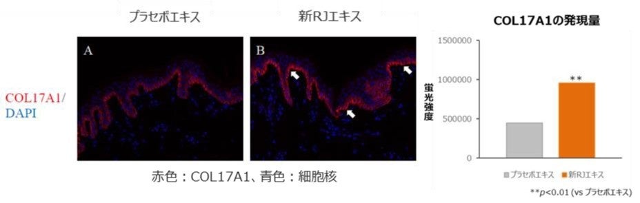 ヒト由来の皮膚組織に新RJエキスを塗布すると、基底層部分に存在する表皮幹細胞マーカー(COL17A1※1)の発現が増加した。このことから、新RJエキスの成分は、表皮の奥の基底層まで届き、表皮幹細胞の維持に関わっていることが示唆された。