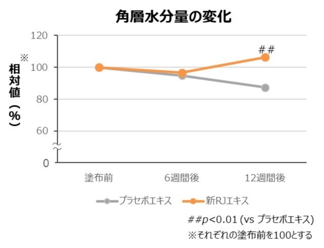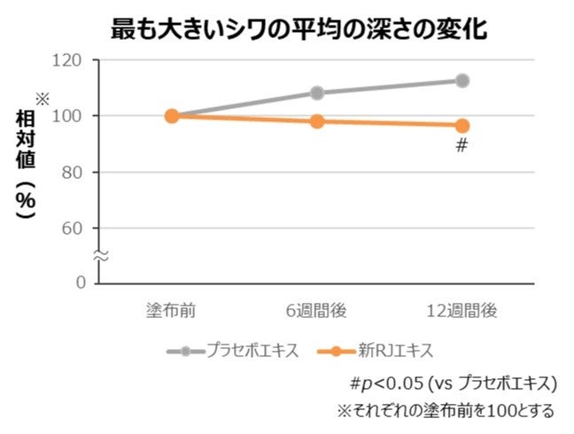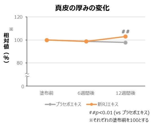 シワなどの肌悩みをもつ健康な女性64人(平均53.6歳)に、顔の左右どちらかに新RJエキスを含有したクリームを、もう一⽅には新RJエキスを含有しないクリーム(プラセボ)を、1日2回、12週間塗布してもらった。塗布前、塗布6・12週間後に、目尻のシワの状態や角層水分量、真皮の厚み、キメの状態を測定した。