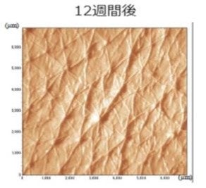 新RJエキスを塗布した側では、塗布前と⽐較して12週間後で、キメ体積率※1・キメ⾯積率※2・キメの最大深さが向上した。すなわち、頬表⾯の凹凸がはっきりし、肌のキメが改善した。