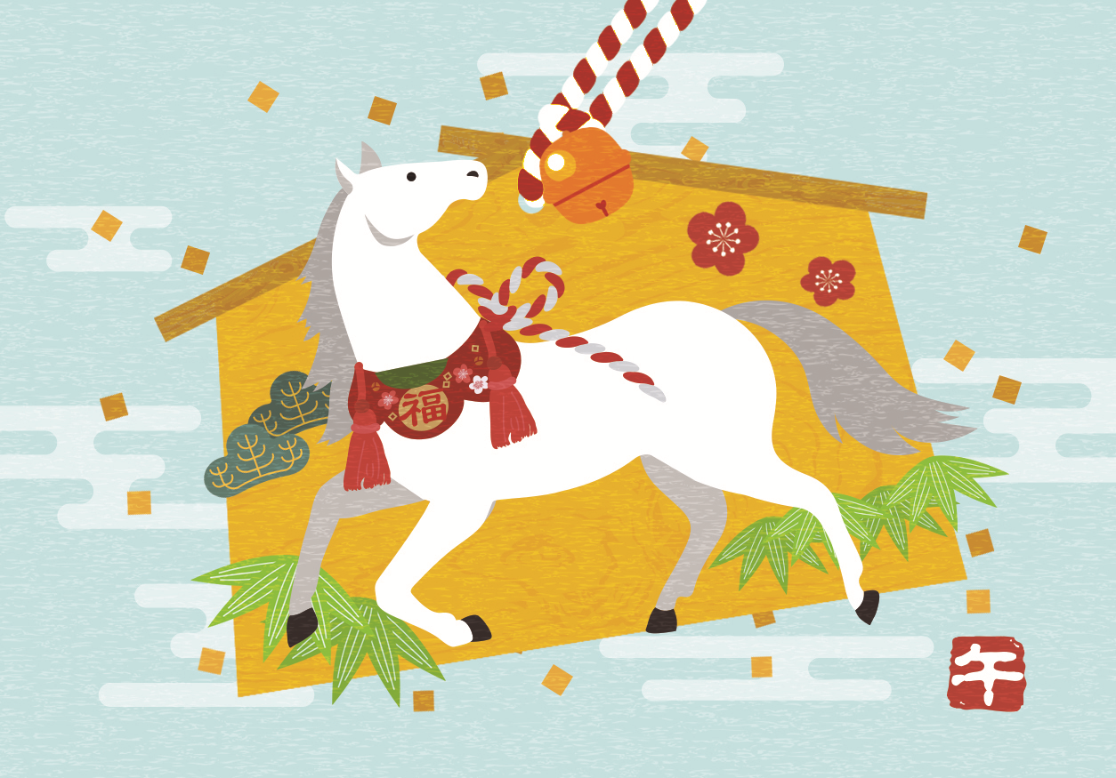 2026年の干支である「午」にちなみ、絵馬に白馬をあしらった縁起のいいデザインです。