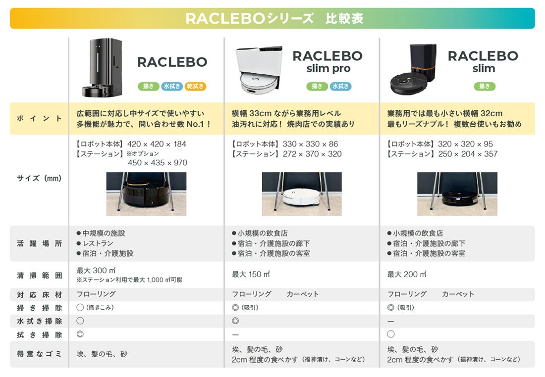 ROBOTIでは、飲食店やホテル業界におすすめの業務用清掃ロボット「RACLEBOシリーズ」を3製品展開しています。
