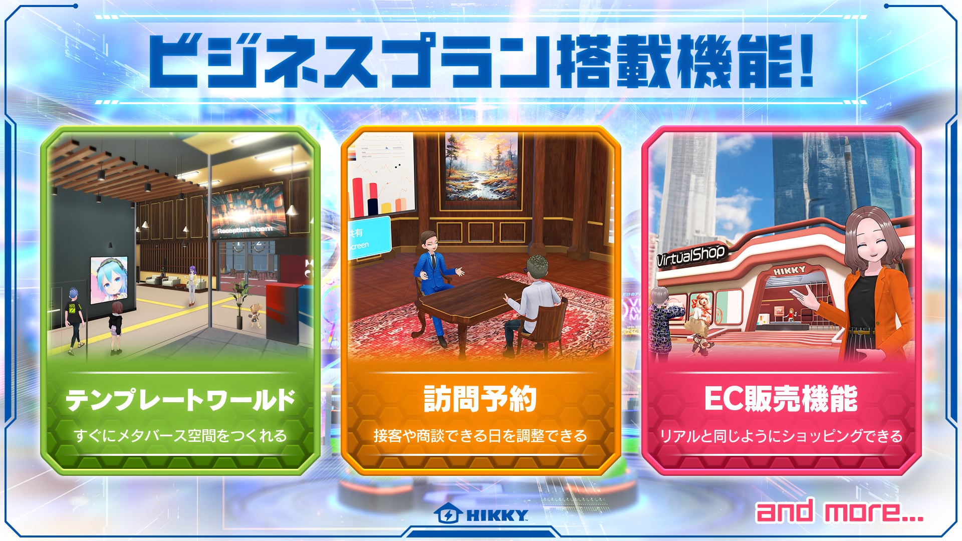 ビジネスプランでは、特別な知識がなくてもすぐにメタバース空間を立ち上げることができる2種類の会場テンプレートや、訪問予約機能といった、メタバースを活用した新たなビジネスモデルの構築を支援する機能を提供します。さらに2023年内には、ECサイト(Shopify)との連携機能も実装予定。これにより低コストでのメタバースビジネスへの参入が実現し、イベント開催だけでなくショッピングや商談、カンファレンスなど、さまざまな用途でメタバースを活用する可能性が広がります。
