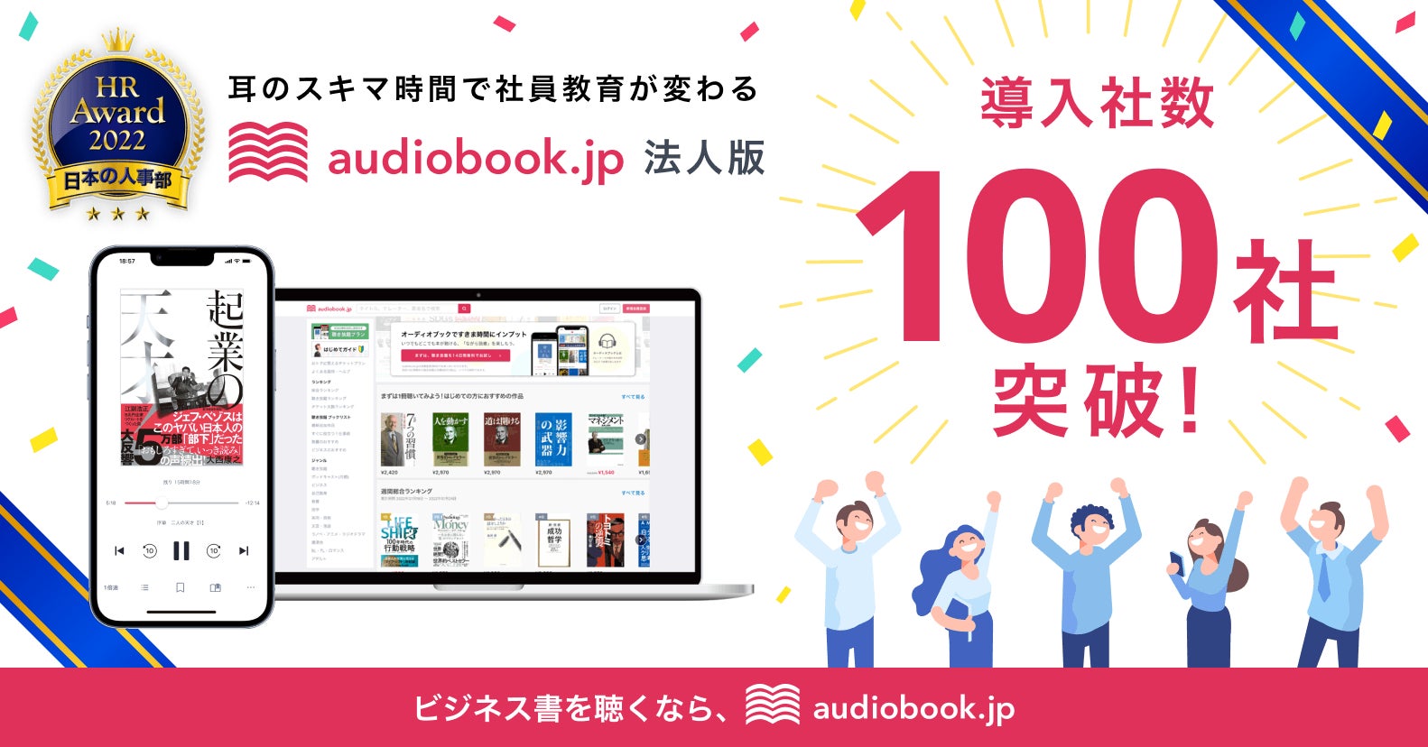 「audiobook.jp 法人版」は、そんなオーディオブックを社員教育や福利厚生などに利用できる法人向けの聴き放題プランで、2022年1月26日に本格的に提供を開始しました。当プランは昨年、日本の人事部「HRアワード2022」で優秀賞を受賞するなど人材育成のツールとして高く評価され、提供開始から約1年3ヶ月で導入企業が100社を突破しました。