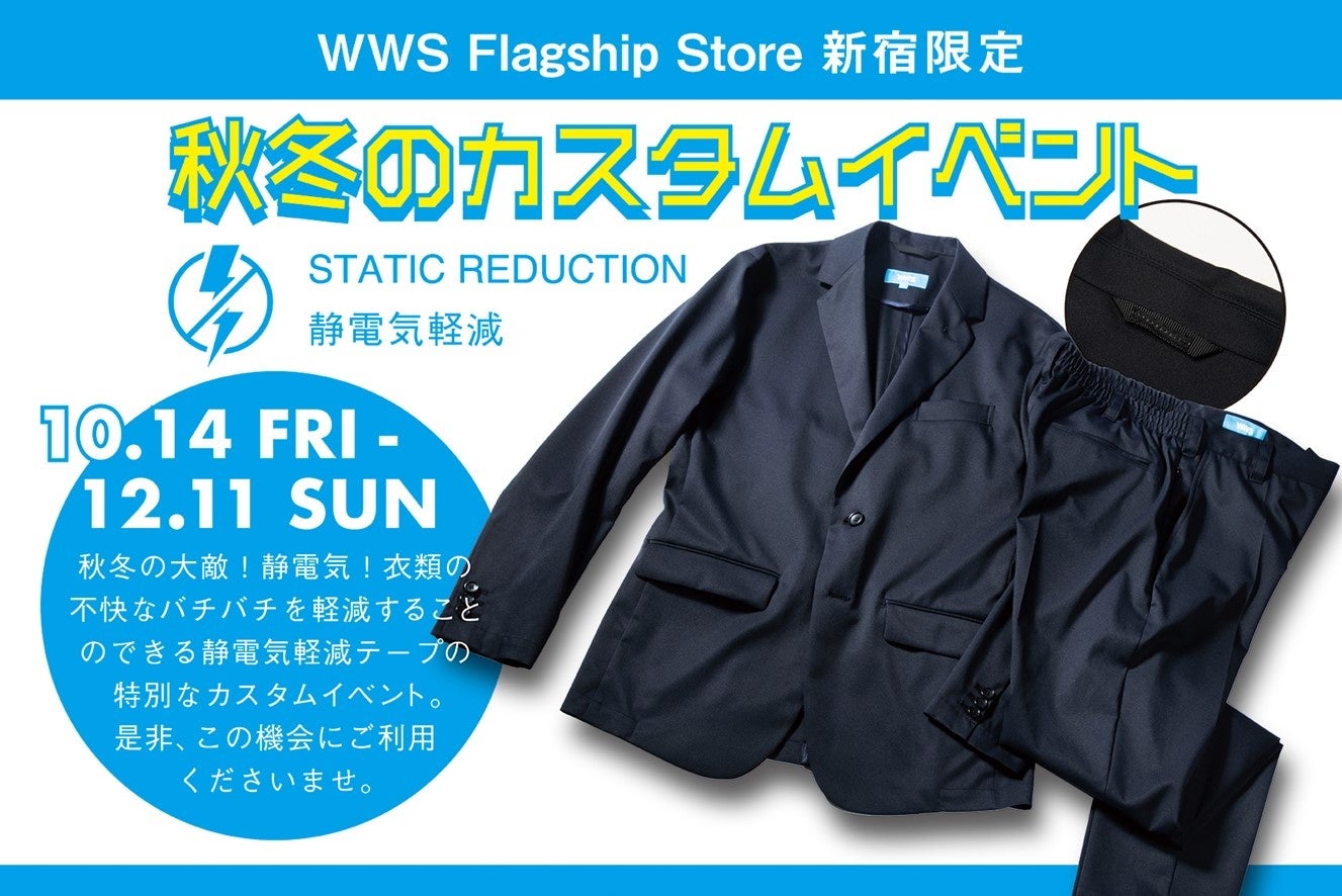 内容:期間中にWWS Flagship Store 新宿にて対象商品をご購入したお客様の中からご希望者様に、静電気軽減テープを内側に縫い付けるカスタムを施します。