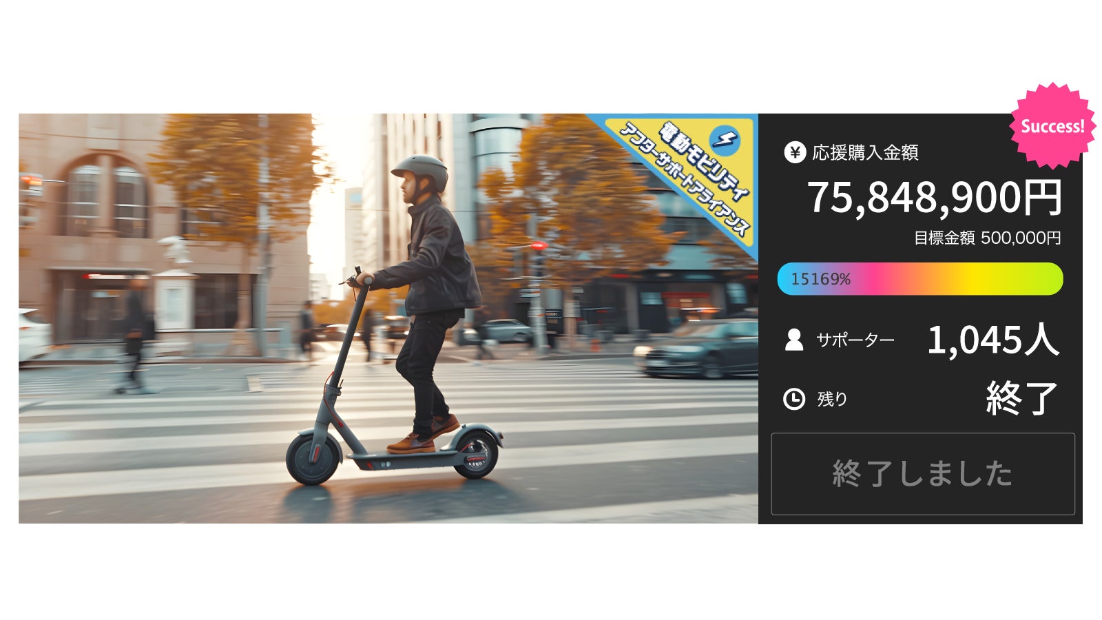 本制度の対象となるプロジェクトは、第一種原動機付自転車、第二種原動機付自転車、特定小型原動機付自転車のうち、電動の商品をリターンとするものです。さらにそのうち一定の条件を満たした場合(※1)、実行者は申込が可能となります。