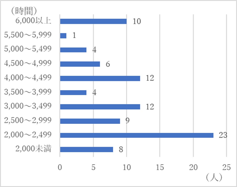 奈良市の認定農業者への聞き取りによると、年間労働時間が2,000時間を超える者が9割を超えています。2,000時間は他産業の一般的な労働時間の基準ですが、中にはその3倍となる6,000時間を超える農業者も1割程度存在し、農業がいかに重労働であるかが伺えます。