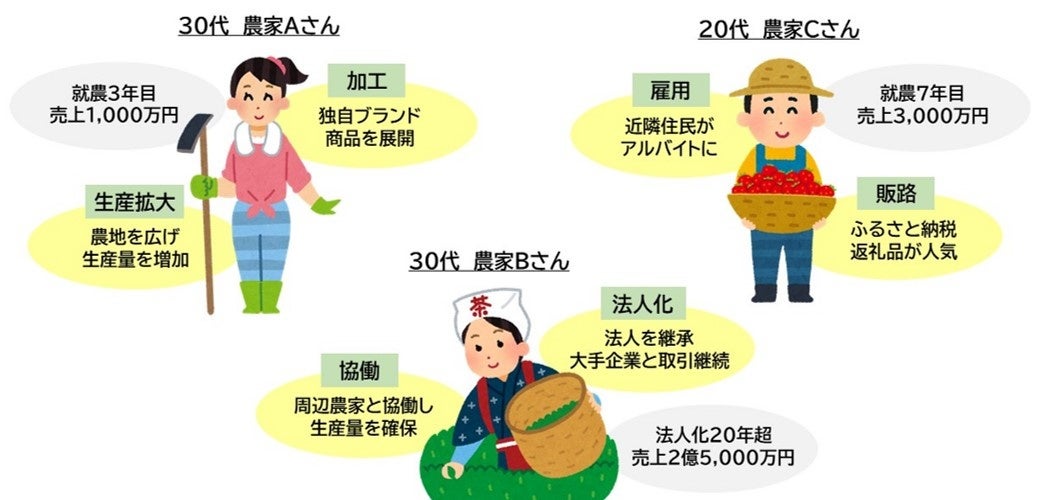 彼らは、従来型の家族経営による「経験や勘に頼る生産中心の農業」とは一線を画し、独自販路の確保、法人化、近隣住民の雇用、生産拡大など、+αの活動に取り組むことで、自らの農業経営の向上を通じ地域活性化にも貢献しています。