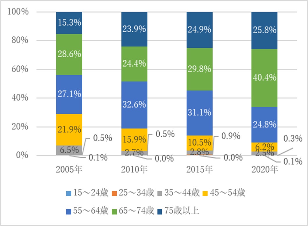 奈良市の農業経営者は年々高齢化しています。中でも65歳以上の比率を見ると、2005年は43.9%だったのに対し、2020年では66.2%まで上昇しています。