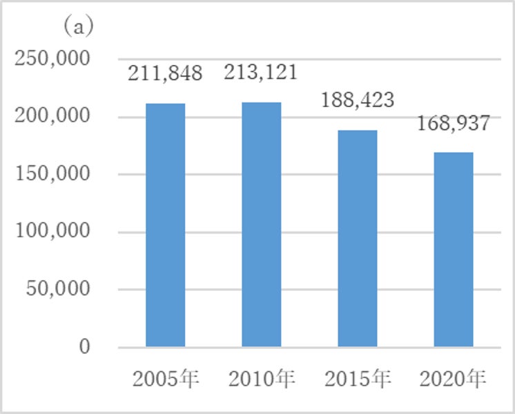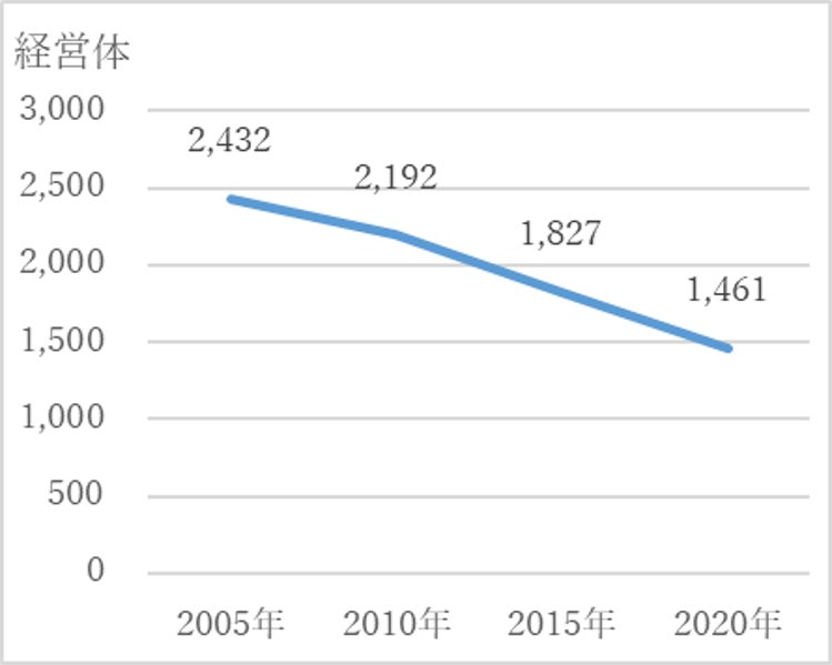奈良市では農業経営体※1数が年々減少しており、2020年は、2005年に比べて約1,000経営体減の1,461経営体となりました。これに伴い経営耕地面積も、2020年は2005年から42,911a減の168,937aとなっています。