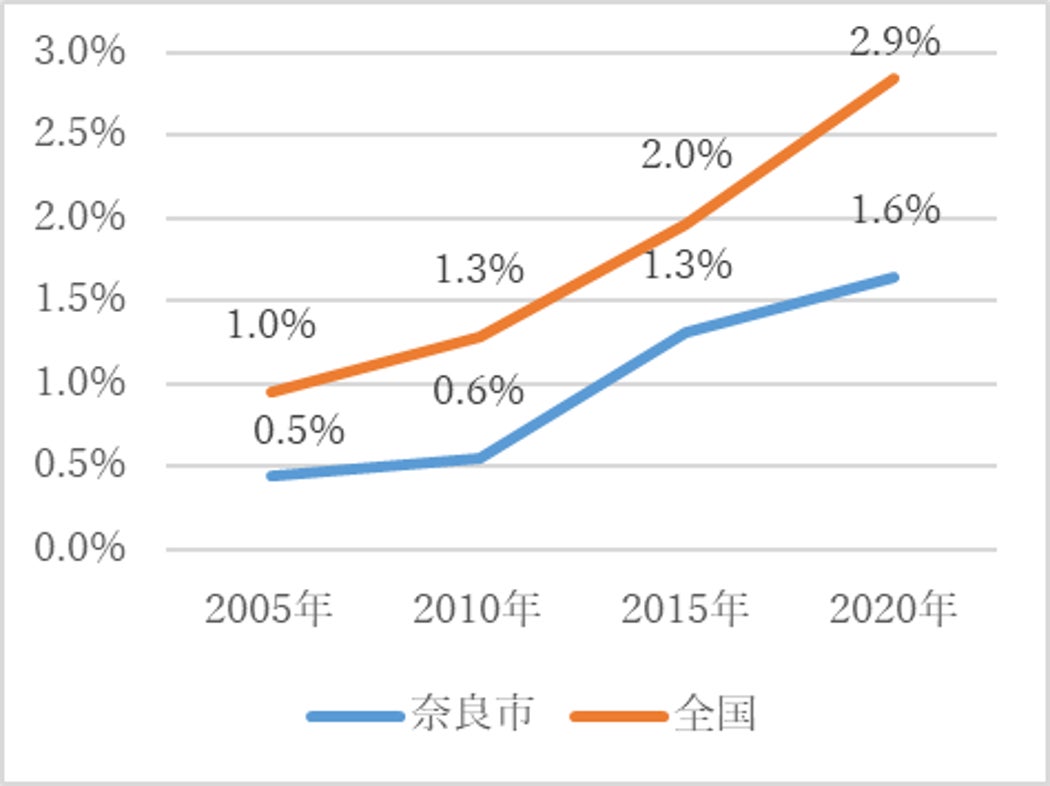 奈良市の農業経営体の法人化率は年々上昇しているものの、全国と比べても低水準で推移しており、2020年は1.6%に止まっています。本市の農業は、ほぼ個人経営により支えられていることが分かります。