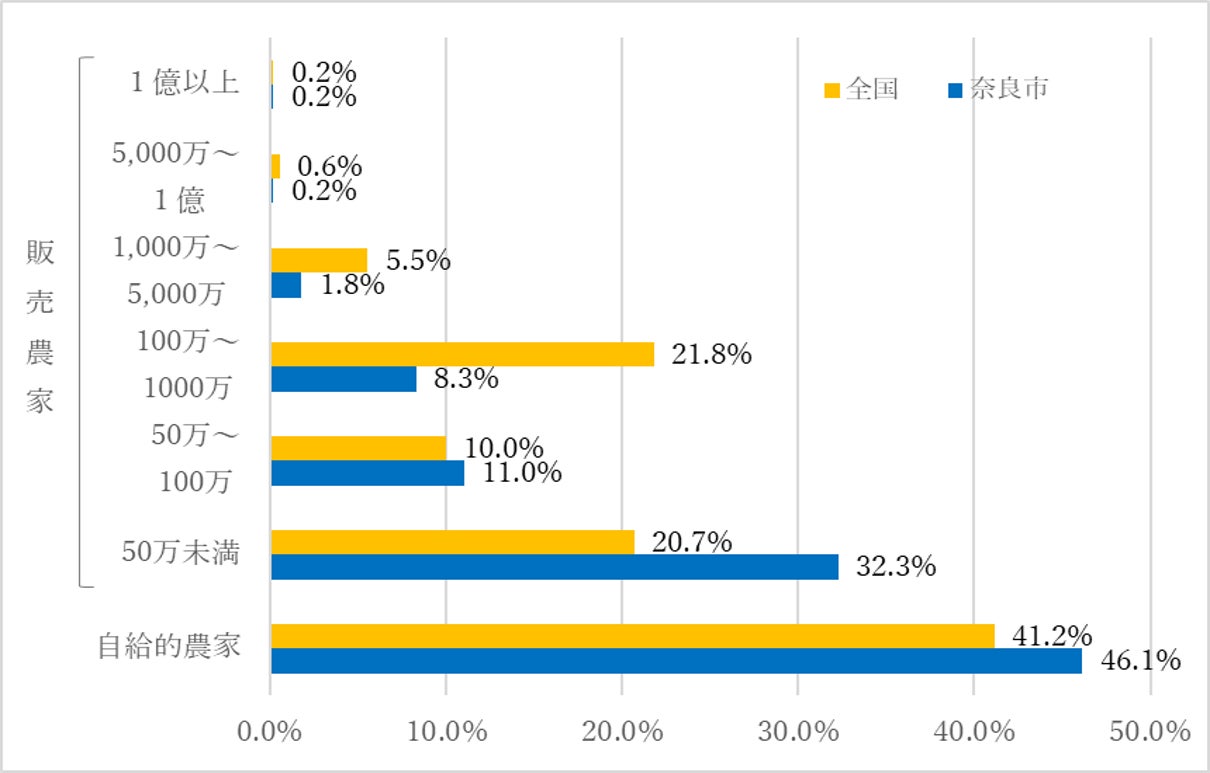 販売金額で見ると、販売農家※2における販売金額は、奈良市は50万円未満が32.3%と最多である一方、全国では100万~1,000万円が最多であることから、本市の農業が小規模経営であることが伺えます。なお、奈良市の自給的農家※3の割合は46.1%であり、農家のうち約半数は積極的な販売活動を行っていません。