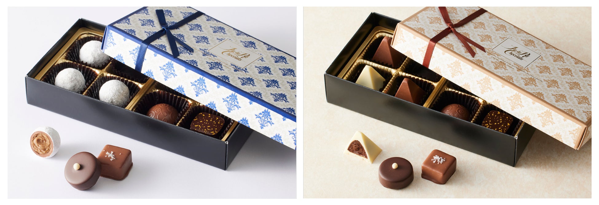 「フルール・ド・セルショコラ」と「バタープラリネトリュフ」、「フルール・ド・セルショコラ」と「キャラメルショコラ」をアソートした2種のギフトボックス。