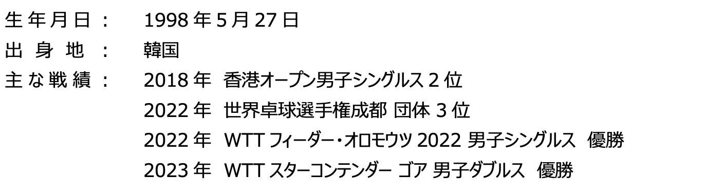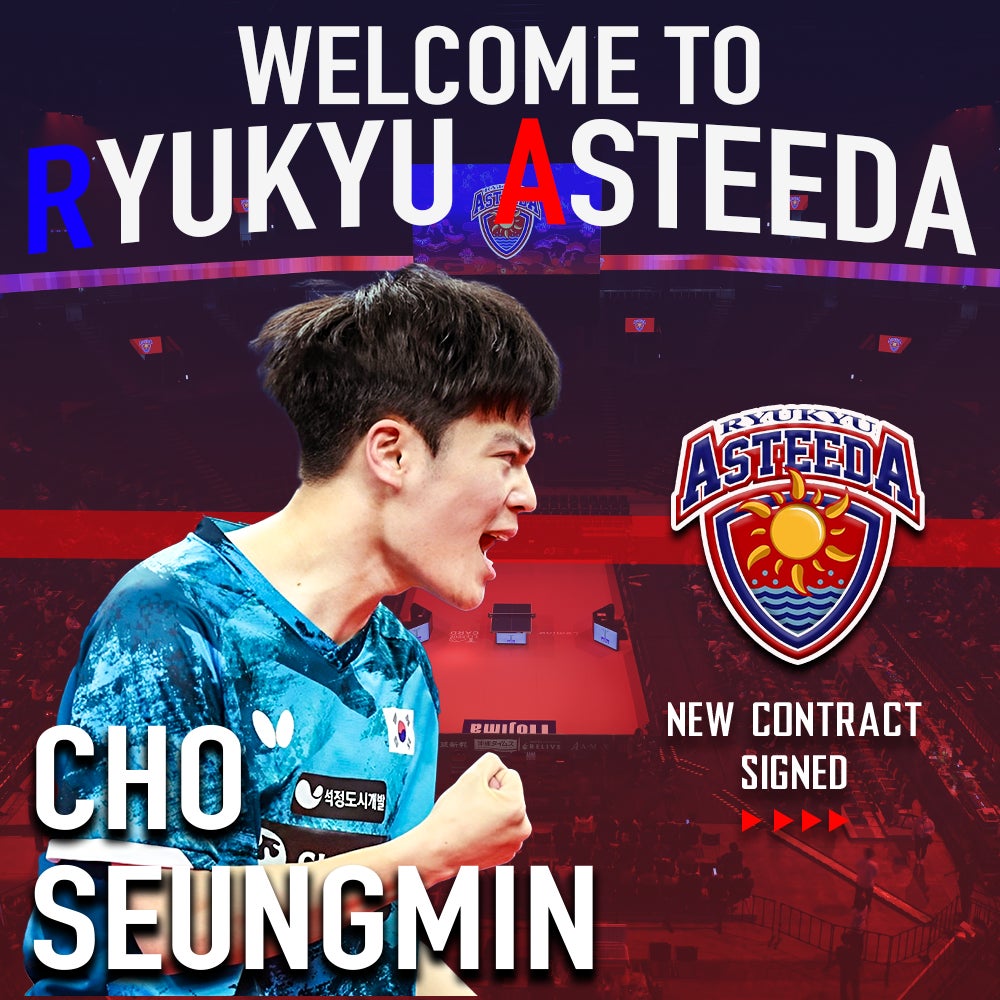 皆さん、こんにちは。この度、琉球アスティーダに加入することになりました、チョ・スンミンです。Tリーグでのプレーは2年目となりますが、昨年よりもさらに成長した姿をお見せできるよう、日々努力を重ねてまいります。今シーズンは、王座奪還に貢献できるよう、全力でプレーします。応援をよろしくお願いします!
