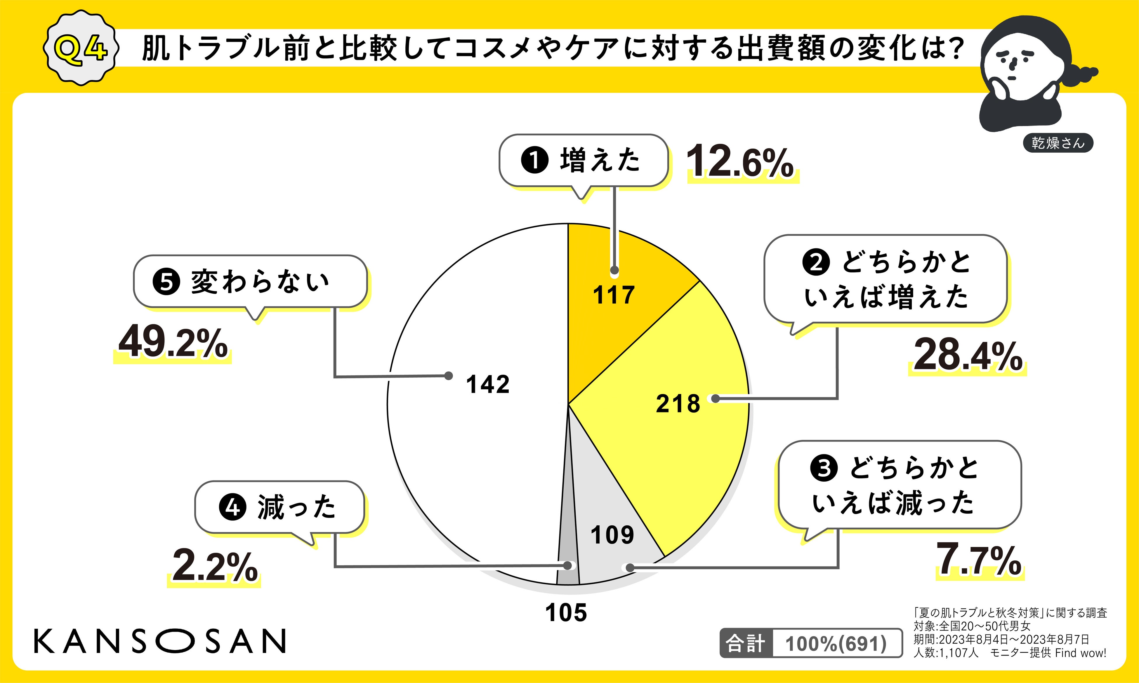 「肌トラブル前と比較してコスメやケアに対する出費額は変化しましたか?」と質問したところ、『増えた(12.6%)』『どちらかといえば増えた(28.4%)』と回答しました。