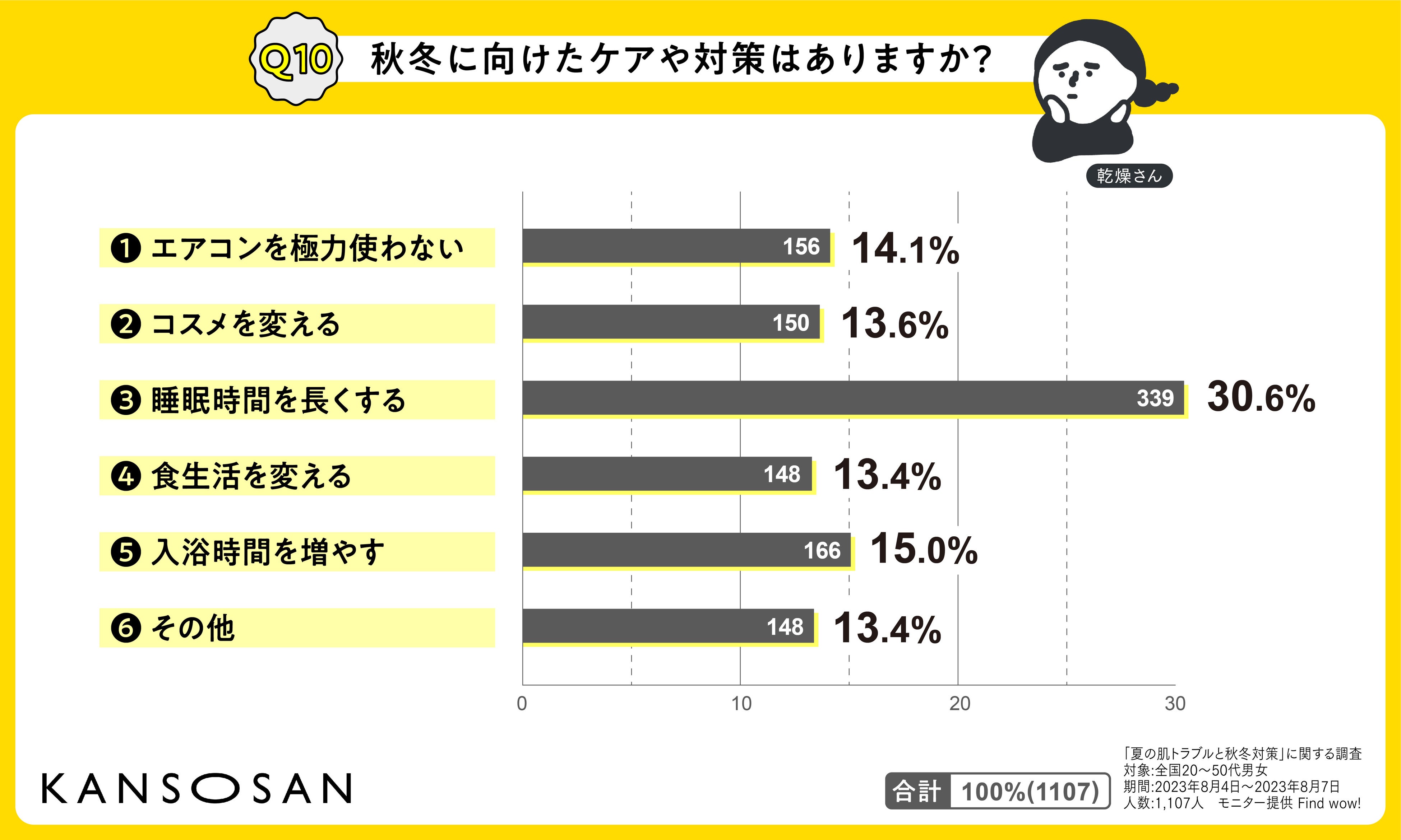 「秋冬に向けたケアや対策はありますか?」と質問したところ、『睡眠時間を長くする(30.6%)』『入浴時間を増やす(15.0%)』『エアコンを極力使わない(14.1%)』『コスメを変える(13.6%)』『食生活を変える(13.4%)』と回答しました。