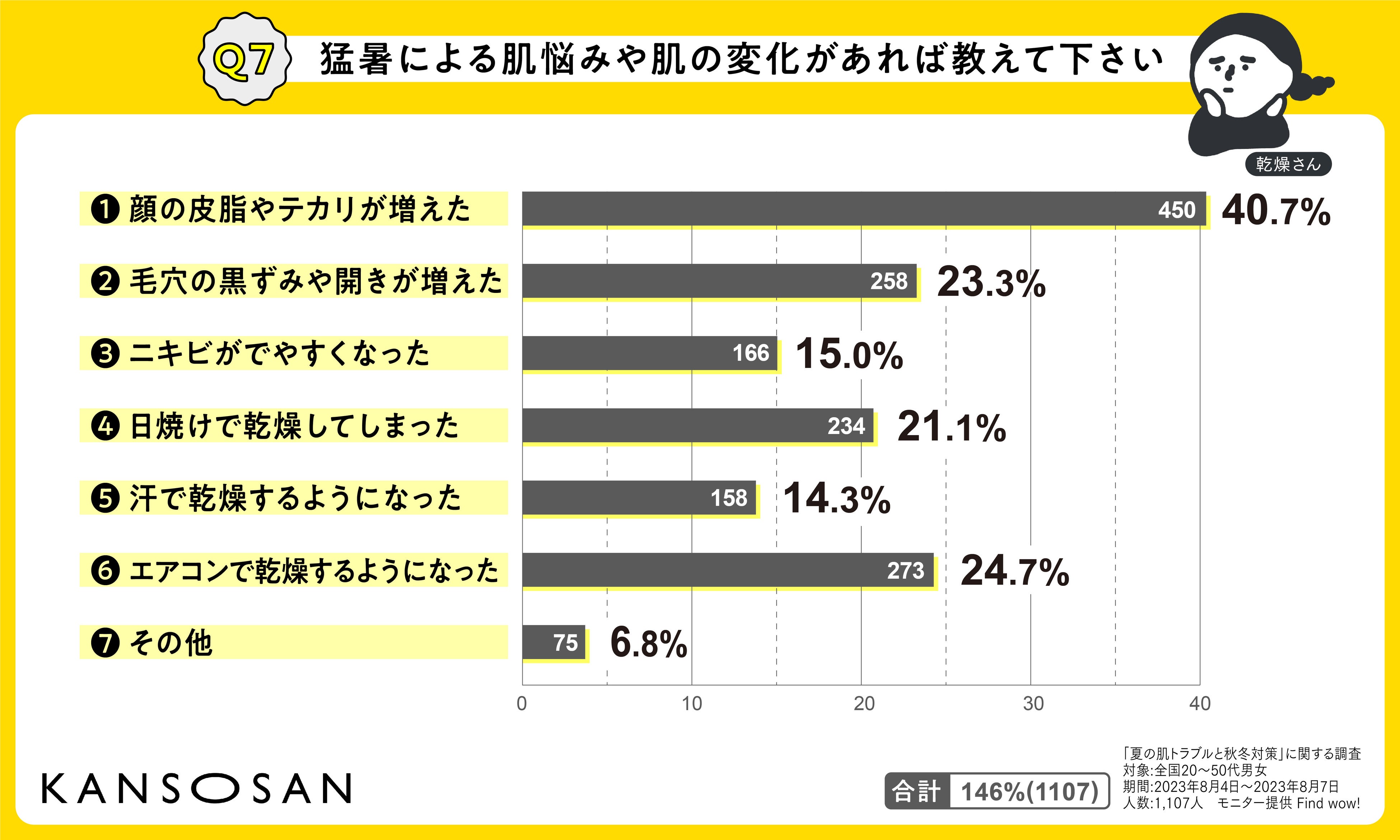 「猛暑による肌悩みや肌の変化があれば教えて下さい。(複数回答)」と質問したところ、『顔の皮脂やテカリが増えた(40.7%)』『毛穴の黒ずみや開きが増えた(23.3%)』と回答しました。